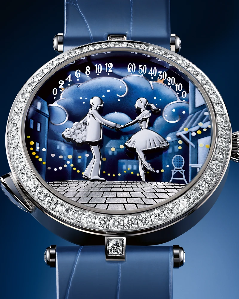搭載自動機械裝置的機芯會在正午和午夜驅動,引領戀人聚首街角,互贈傾情一吻,配戴者只需輕按錶殼上的按鈕,便能隨時重溫甜蜜時刻;另外,雙逆跳系統指揮兩點星光,揭示小時和分鐘的行進步伐,延續系列腕錶自身獨有的顯時方式。錶盤則以立體構圖透過五重層次展現,灰階和彩色墨彩琺瑯呼應夜幕下的光影,節日燈飾和巧手工匠以白K金鋪砌的鵝卵石大街再現巴黎街頭的景色,錶底蓋延續錶盤上的動人約會,以藍寶石水晶鏡面上的琺瑯印花和鐫刻勾勒戀人共舞身影,可說無一處不精緻。