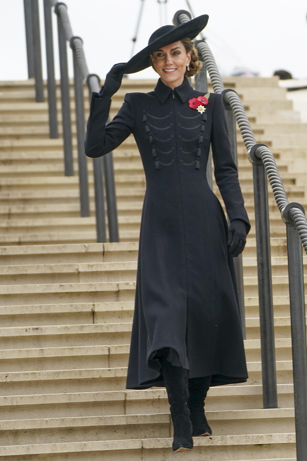 11月在追思儀式中,凱特王妃再度穿上一件黑色軍式Catherine Walker外套,並且搭配一頂沒有過多裝飾的雕塑弧帽,展現王妃的莊重與氣勢。