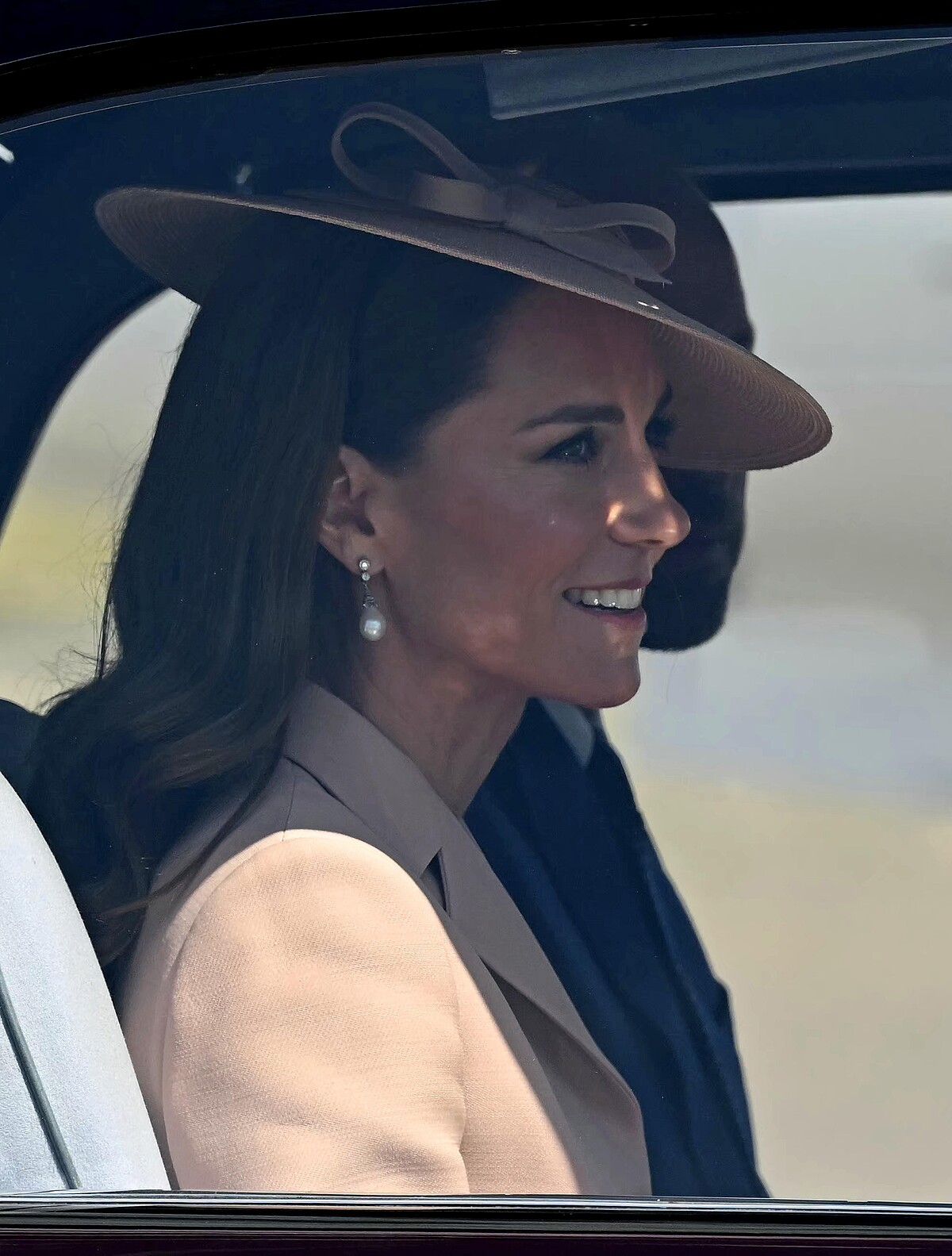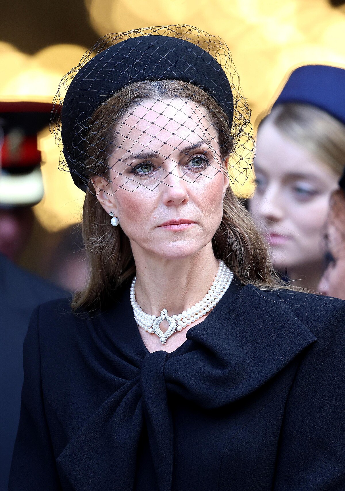 凱特王妃再次穿上曾陪伴他面對皇室告別式的黑色洋裝,並搭配一頂黑色圓帽搭配細面紗現身。他的黑色面紗如一條細細的界線,讓哀悼保有個人的私密性與嚴肅性。