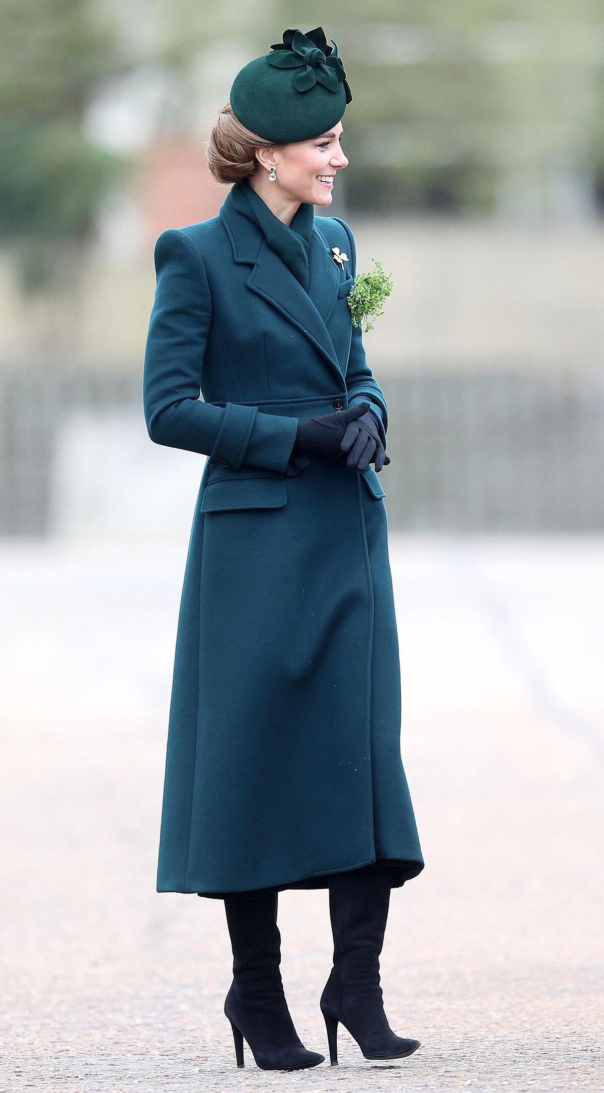 在威靈頓軍營舉行的「2025年聖派翠克節愛爾蘭衛隊閱兵式」上,身為該團軍團上校的凱特王妃以正式軍團身份出席儀典。他選穿一襲象徵榮耀的綠色 Alexander McQueen 外套裙,向愛爾蘭衛隊致敬;而頭頂的 Lock & Co. 帽飾以俐落線條勾勒軍紀精神,完美詮釋英國皇室在儀式場合中的沉穩與尊崇。