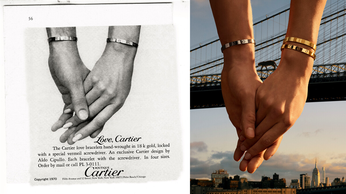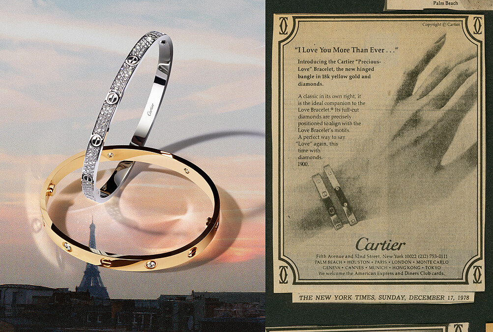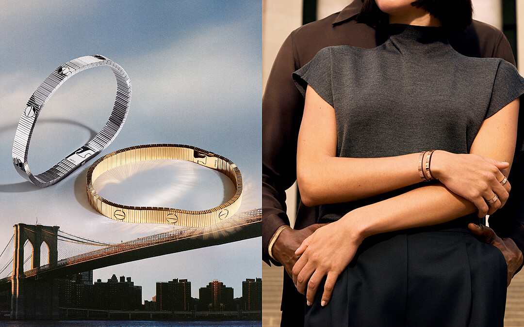 1969 年,Cartier於紐約推出LOVE手環,以前所未見的造型與開合方式,徹底革新了人們以珠寶表達愛意的方式,極具辨識度的標誌性橢圓形輪廓、外露的螺絲圖案,以及需要靠對方運用螺絲起子才能開合手環的設計,將抽象的「承諾」具體化做行動—將愛鎖上。而這,不只是一份愛情宣言,更是一份願意為愛承擔、為愛冒險的勇氣。