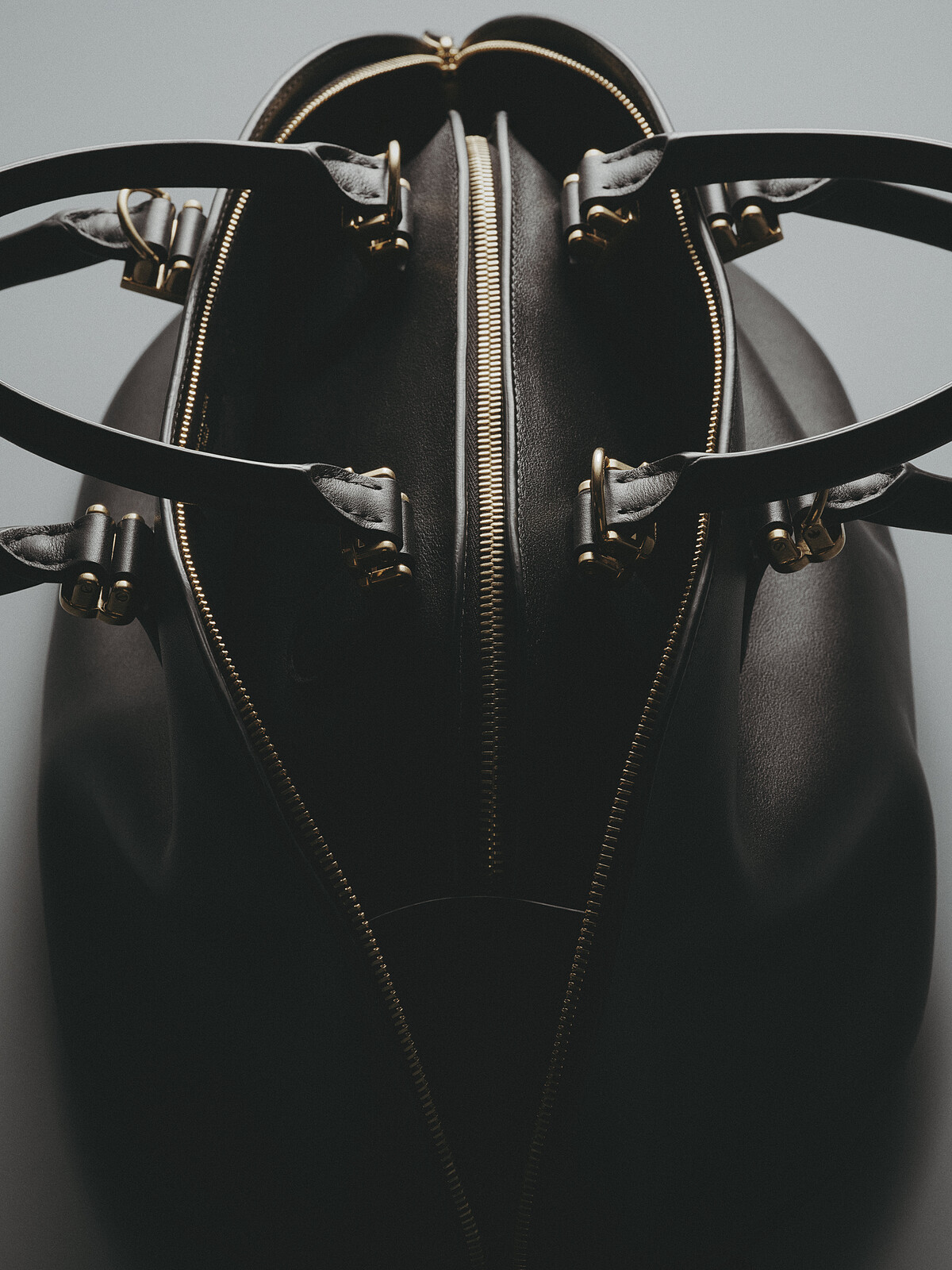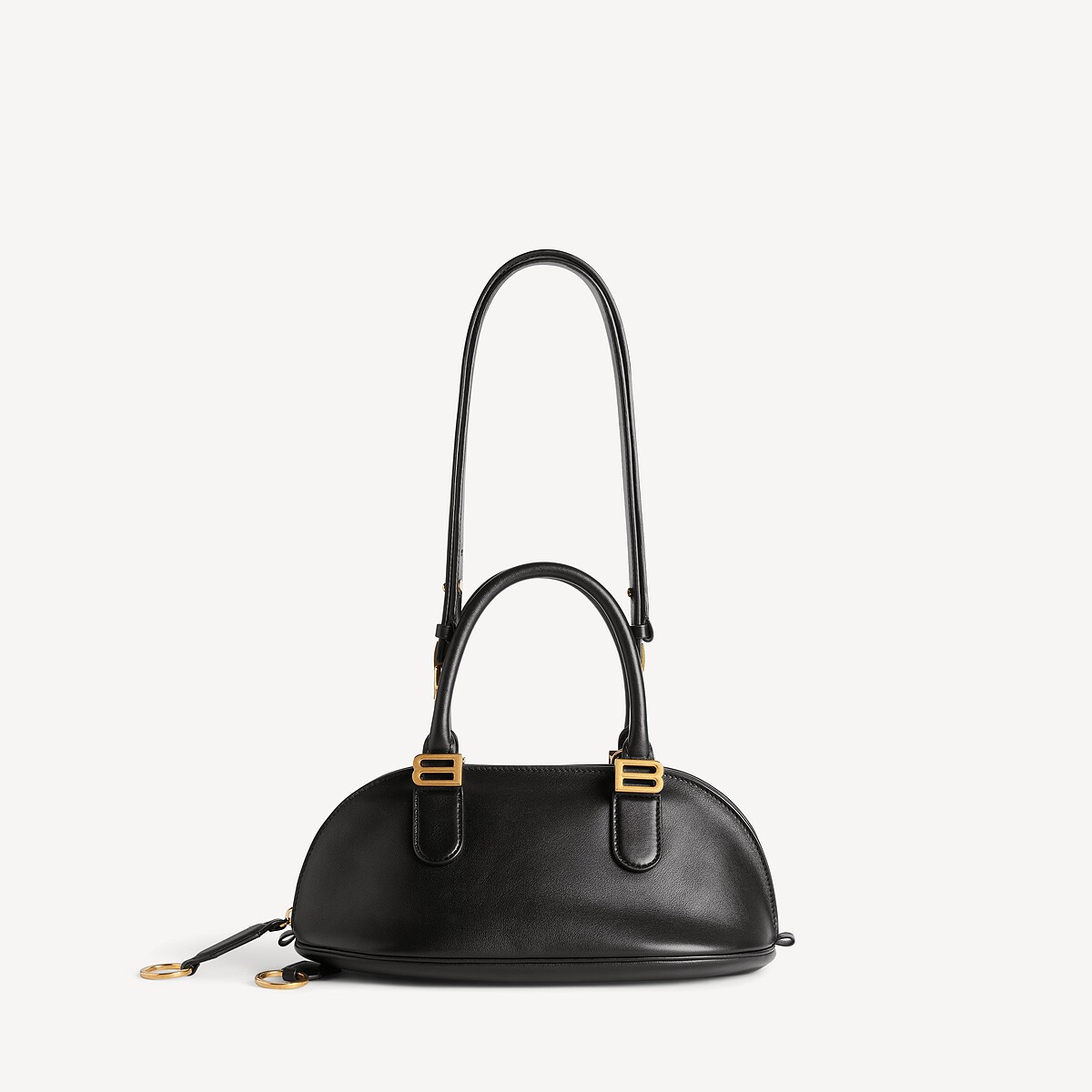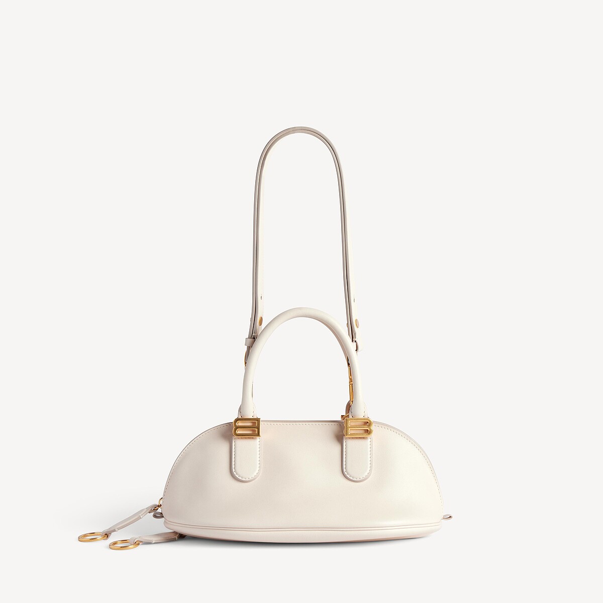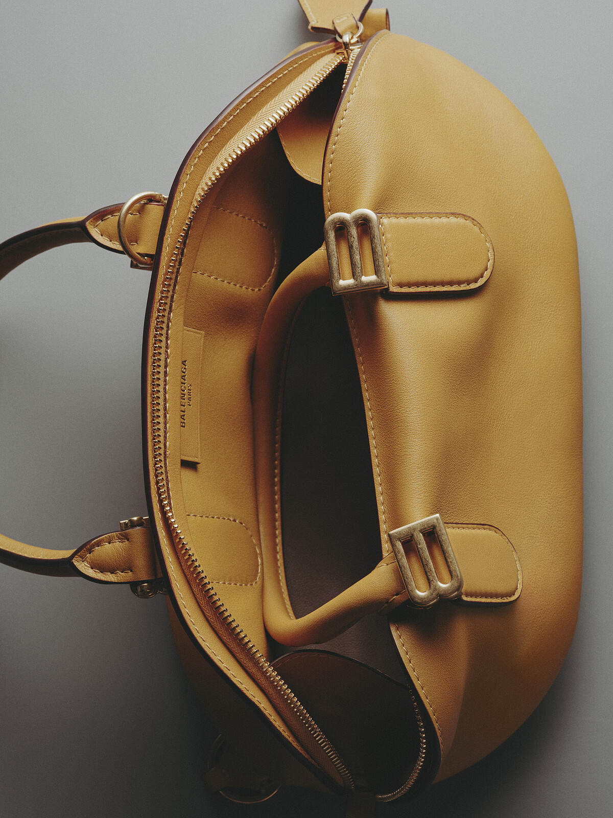 Bolero 最鮮明的視覺識別,在於那道沿著包身環繞的拉鍊結構——拉鍊的開合不僅保有實用性的強大功能,更維持了整體廓形的建構,當開口程度改變時,包身隨之展現不同的包覆感(這點也巧妙呼應 bolero 外套貼合身形的姿態)。另外,兩端搭配鑰匙扣造型的皮革拉頭,在觸覺層面增添記憶點,使每一次拉合都帶有細微的手感。這一細節並未過於繁複。反而透過隱藏式連接與收邊處理,讓整體視覺維持圓潤而簡約,保留了 Balenciaga 一貫的結構風格。