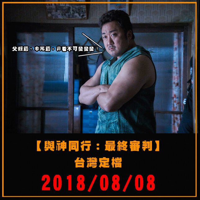台灣發行商宣布,去年底的賣座電影《與神同行》即將要在今年8月8日在台上映,並且釋出了最強大叔馬東石的宣傳視覺,讓各方超級期待啊~