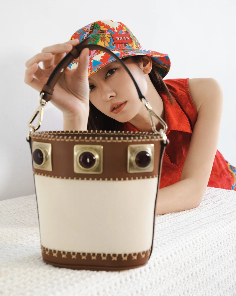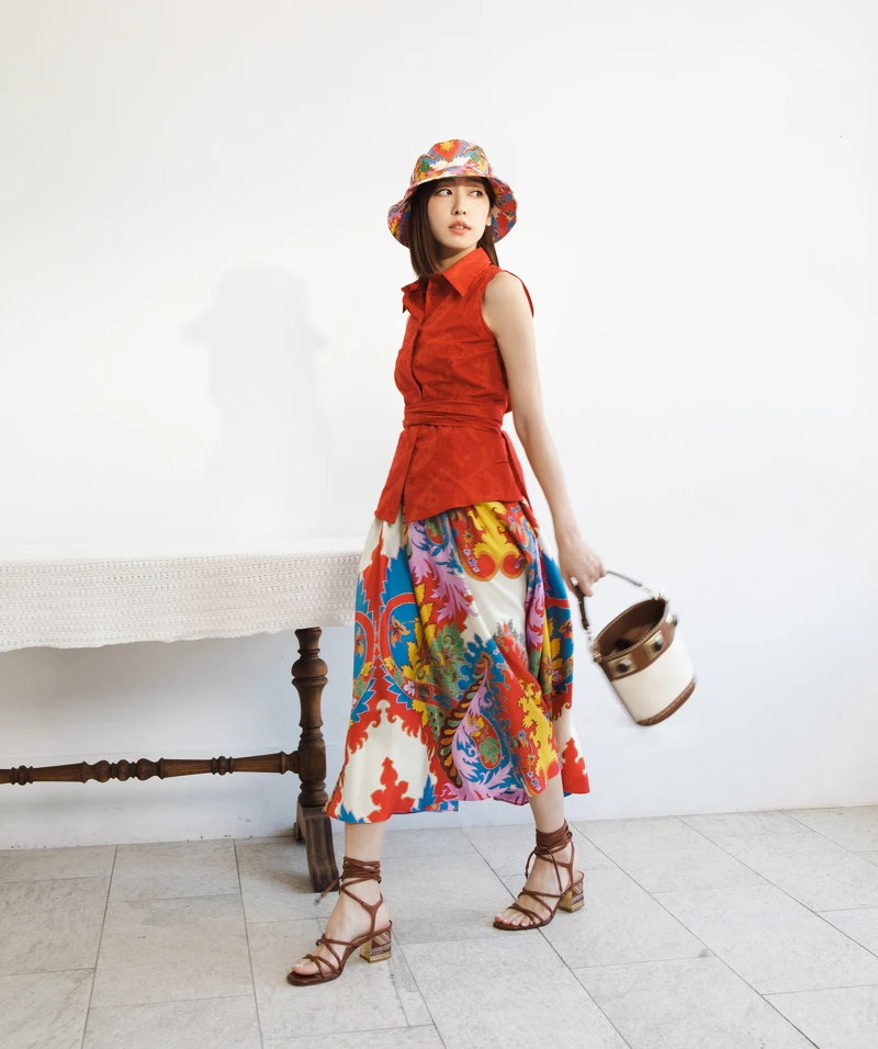 滿滿異國情調的紅色基調造型,以綻放絢麗花朵圖案漁夫帽及膝下圓裙,隔著時尚正紅色無袖束腰襯衫的彼此和諧呼應,絕對會成為春夏暖陽照射下最耀眼的存在,隨手再拎上點綴著寶石鑲嵌的皮革亞麻拼接水桶包,Perfect!