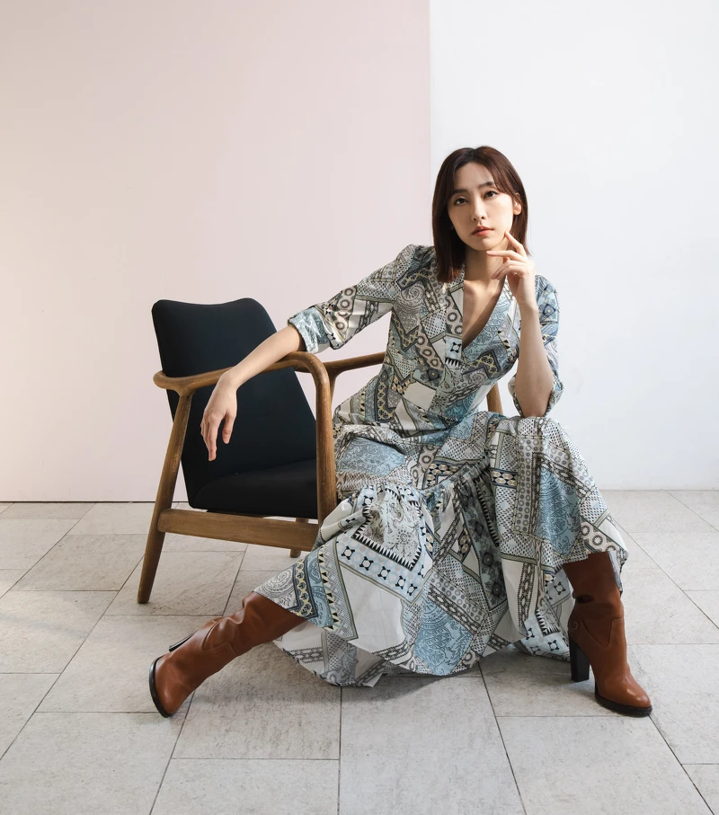 拼接著幾何、緹花與迷幻圖案的V領長裙,以ETRO獨有的藝術美學讓人在穿上後呈現出輕盈不顯厚重的絕佳上乘質感,搭配個性靴款將率性不羈的瀟灑與柔美浪漫女性特質達到完美揉合平衡,也是惟倫自己覺得可以推薦給想嘗試洋裝穿搭,又怕過於甜膩的女孩們在搭配上的最佳選擇方式。