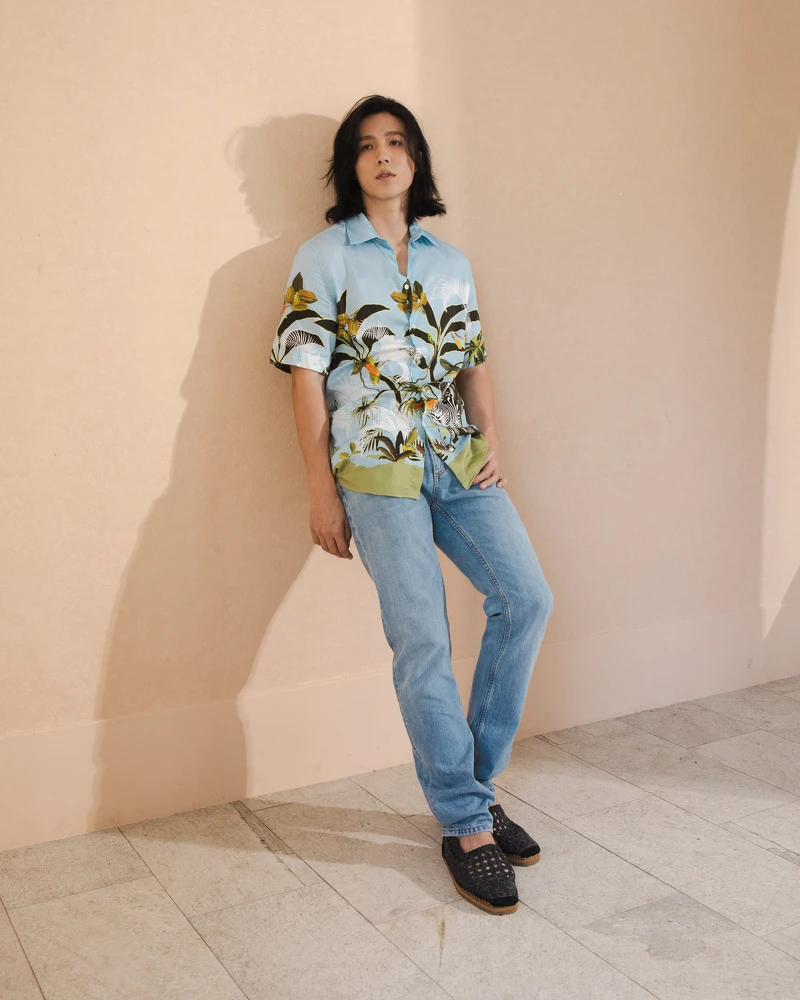 豐盈富麗的夏日繽紛都注入在林禹穿著的短袖絲綢材質襯衫上,隨性搭配上丹寧褲與輕盈草繩鞋底的有型涼鞋,散發著正午強烈炙熱陽光照映的熱帶氣息,同時又有收斂不張揚的度假情調,盡情享受春夏假期無所事事的獨特美好感受。