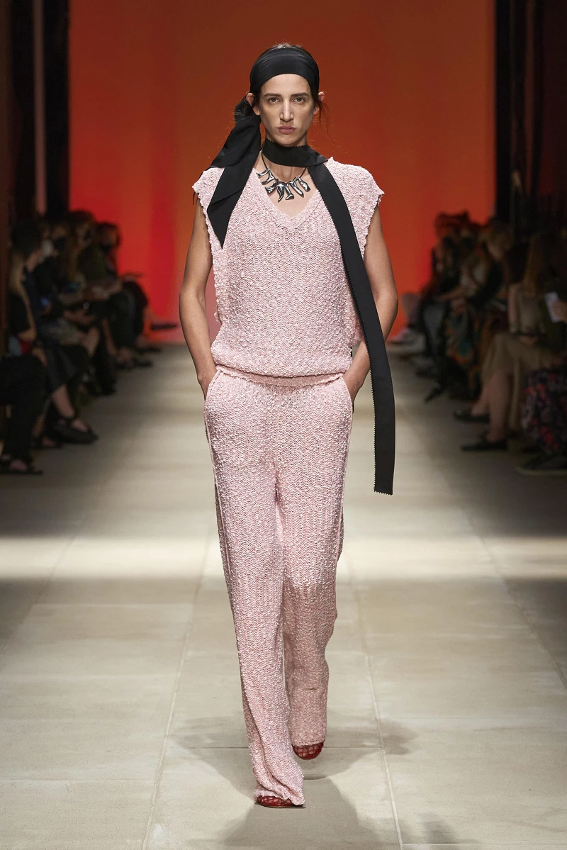 也可以像 Salvatore Ferragamo 2022 春夏系列的秀上示範,運用同色系背心與寬鬆長褲,並用頭巾、絲巾作為配件點綴,打造舒適宜人的簡約風格。