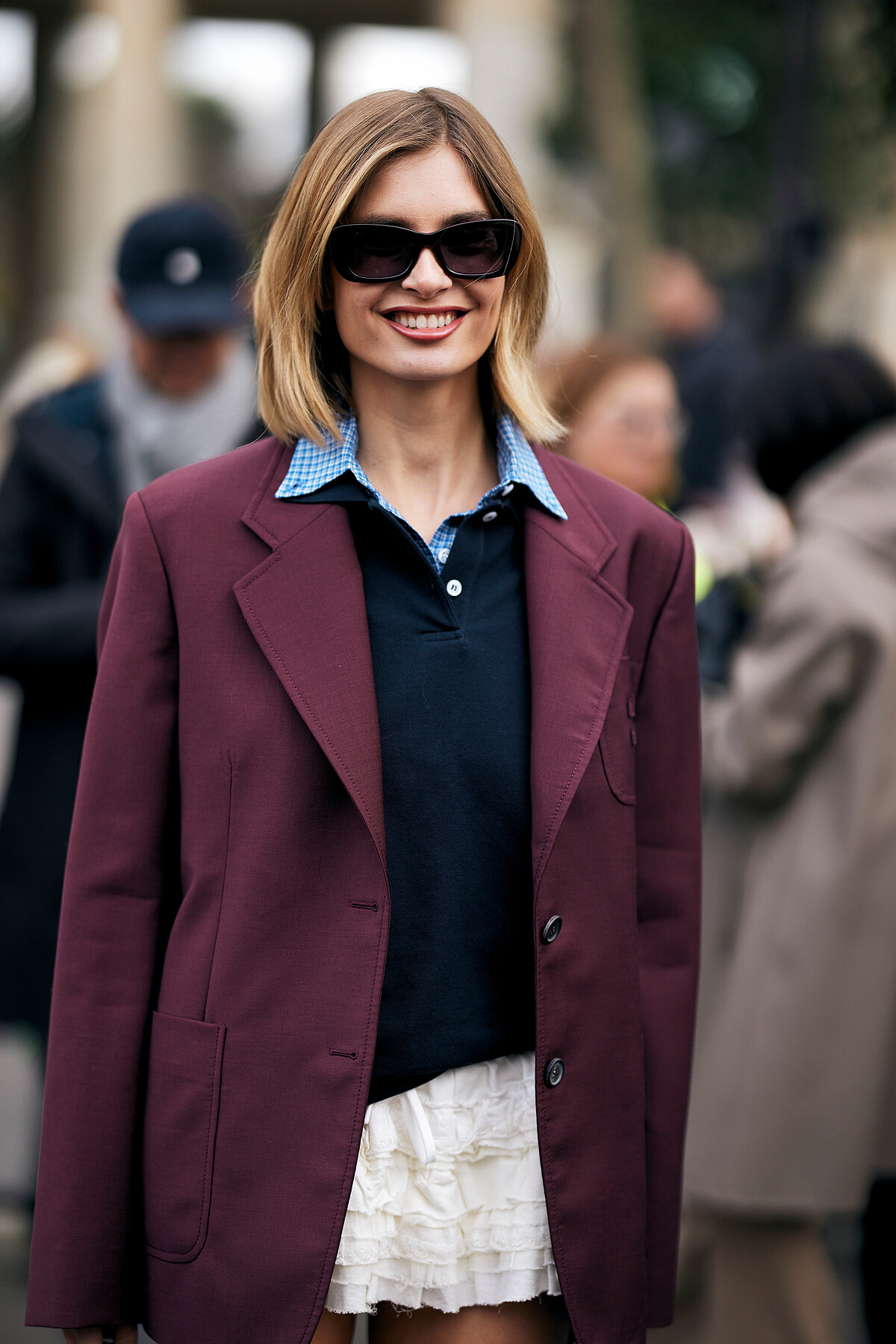 用西裝外套搭配網球裙,除了增添造型的俐落性,整體看起來清爽有個性,做上班穿搭也不違和,推薦給你。
