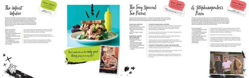《Friends:The Official Cookbook》除了有 菲比(Phoebe )的祖母獨家秘方餅乾和拿手的巧克力曲奇餅乾、瑞秋(Rachel)招牌甜點 Trifle,以及喬伊(Joey)的起士肉丸三明治和特製的 Two pizzas;羅斯(Ross ) 的 Moist Maker 火雞三明治、錢德( Chandler)的起士蛋糕……
