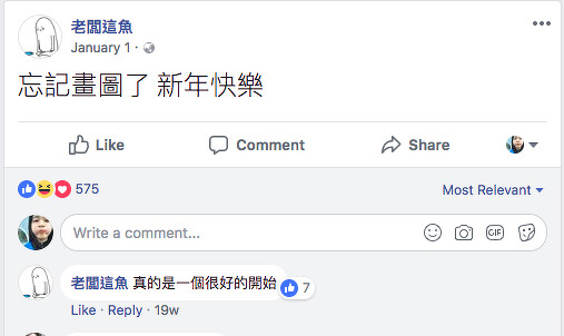 其實老闆這魚從小就喜歡畫畫,但沒有上過任何專業課程,會開始畫插畫,是因為大學時某堂通識課,老師講了非常荒謬沒有道理的話,在台下的她心裡冒出好幾個黑人問號,於是就搞怪地把這個小故事畫成簡單的幾格漫畫,從此便漸漸開始創作插畫了。創立老闆這魚粉專已經四、五年了,一直以來都走一個隨性風,想畫就畫,沒靈感就停,我想看看下面這個新年快樂發文,應該可以對老闆這魚粉絲專頁的經營理念略知一二。