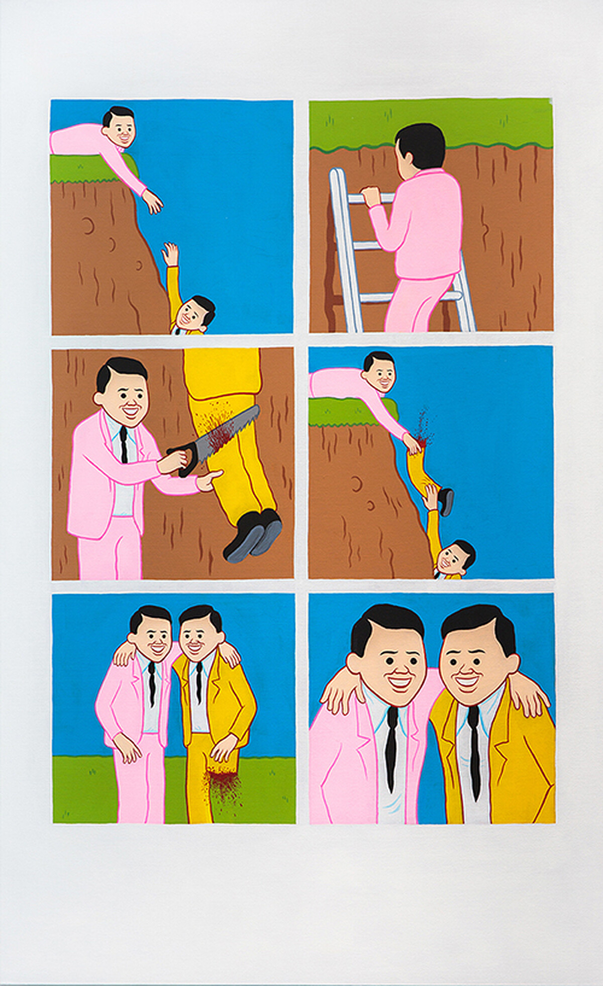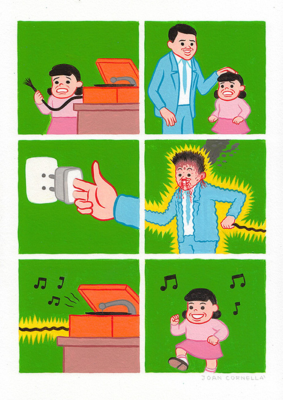 (Joan Cornellà:「在我的漫畫中所有角色都像塑膠做的,無論在身上不斷發生怎樣可怕的事情,臉上始終掛著大大的笑容。所有事情都很誇張,儘管某些行為和現實生活有所關連。」)