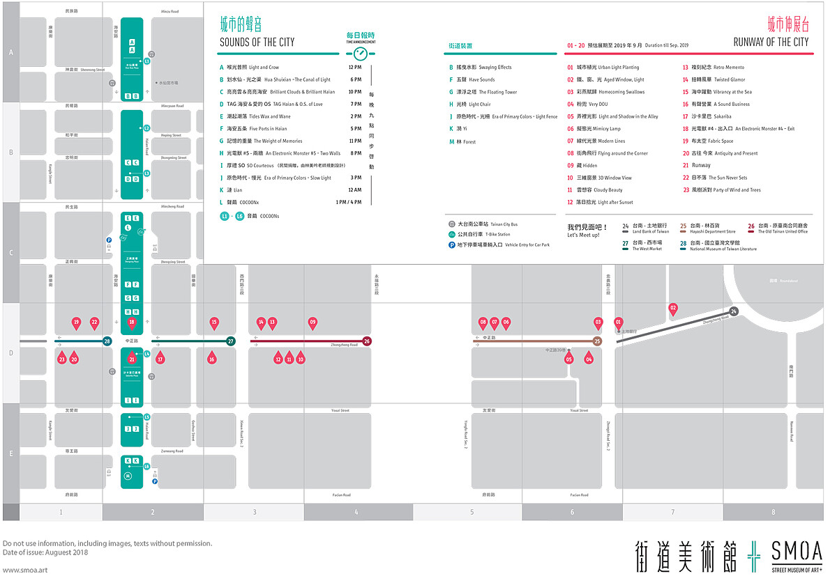 在8/18晚間,2018台南《街道美術館 PLUS》更將舉辦盛大開幕活動!「城市的聲音—輕輕敲響海安路」由2016年奪下美國國際阿卡貝拉大賽冠軍、被譽為「台版歌喉讚」的純人聲演唱團體「尋人啟事」,帶來傳達「城市的聲音」概念歌曲表演。「城市伸展台—點亮臺南中正路」將由臺南稻草人現代舞團與凱渥模特兒,分別以現代舞形式來介紹各藝術作品。節目最後高潮將於21點準時開始,海安路10座藝術塔將同步報時,屆時可選擇自己最喜愛的作品等待聆聽報時。