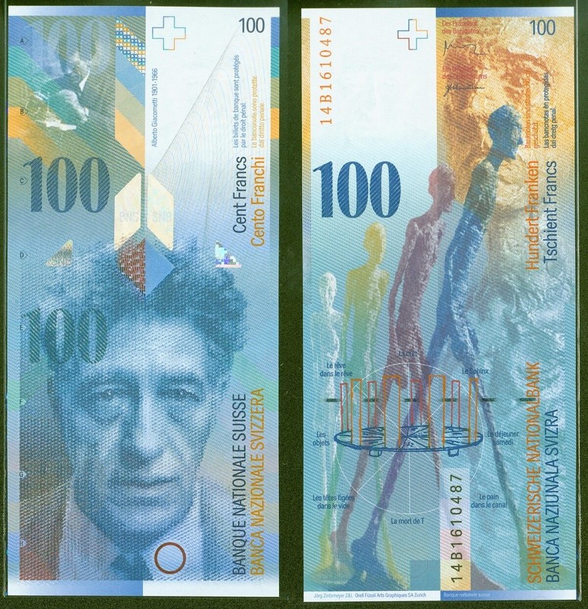(瑞士法郎百元紙鈔正反面。正面為賈柯梅蒂頭像,背面為賈柯梅蒂雕塑作品。)