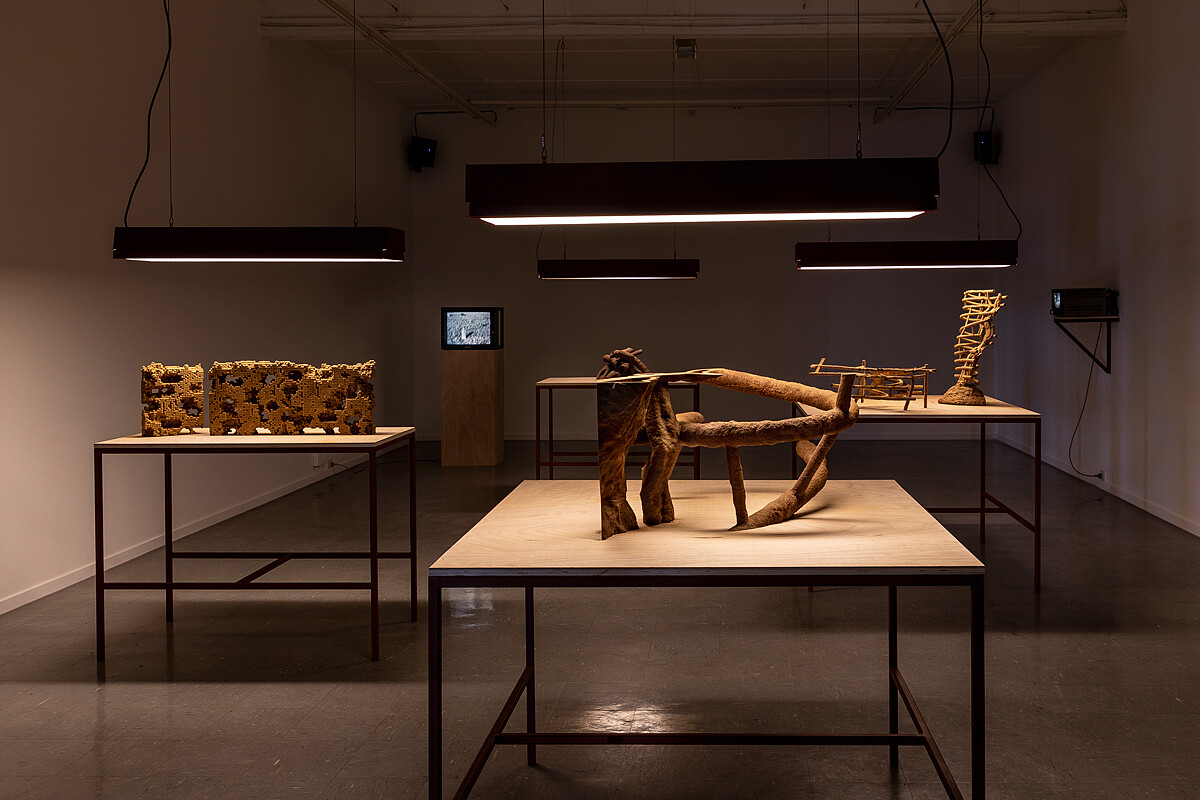 (尼古拉斯.曼甘,《白蟻經濟》,2018。石膏、泥土3D列印、高分子塗料、塑合木板、有色軟鋼、日光燈、四組Sony Trinitron PVM 9042QM螢幕、循環播放錄像檔案、四頻道環繞音響播放白蟻示警聲響。影像由藝術家與澳洲墨爾本薩頓畫廊提供。)