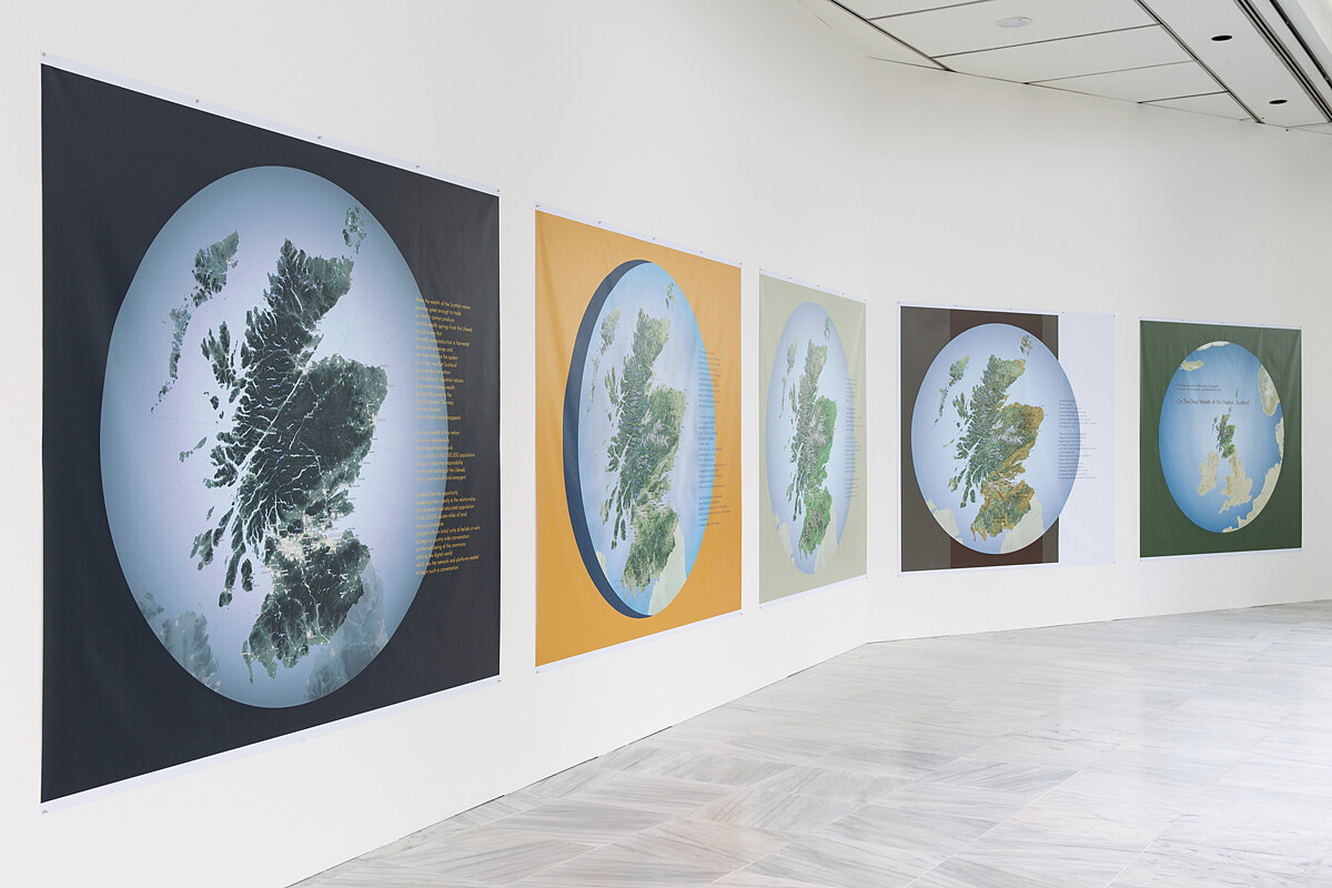 (海倫.哈里森 & 牛頓.哈里森《綜觀蘇格蘭的深層國富》,2018乙烯基印刷 221×213–280 公分© 參展人、臺北市立美術館。)