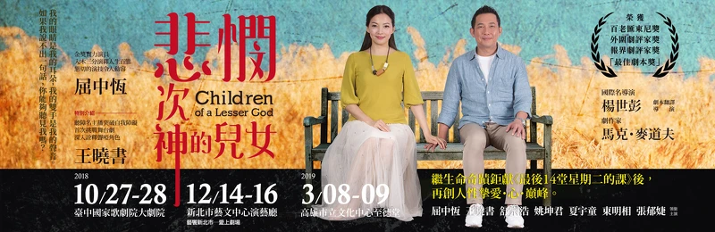 本次果陀推出《悲憫次神的兒女》華人版,由國際名導楊世彭翻譯執導,特邀屈中恆、王曉書、東明相、夏宇童、姚坤君、舒宗浩、張郁婕主演。劇情描述優秀的男老師傑姆斯(屈中恆飾)來到聾人學校,引導聽障學生讀唇語甚至開口說話,但是有個女孩莎拉(王曉書飾),卻堅持不願意開口,好勝的傑姆斯被這樣倔強的莎拉所吸引,兩人接受了彼此的全部,也結為夫妻。卻在一次為了替聽障人士「發聲」的事件中,傑姆斯再度要求莎拉開口說話,但一開口卻挖出莎拉靈魂深處那不可告人的祕密…。