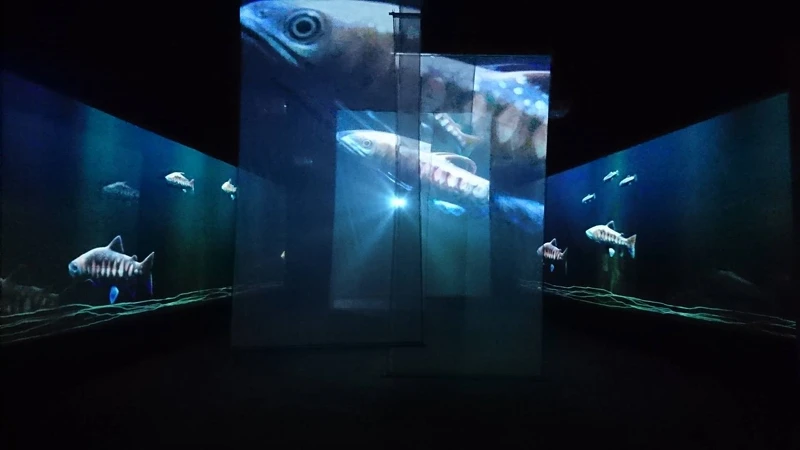 走進中高海拔的世界,觀眾彷彿潛入大甲溪上游,以紗幕投影的影像創造浮空的視覺效果,讓觀眾與櫻花鉤吻鮭同游七家灣溪。且透過卵、幼魚和成魚的影像,感受櫻花鉤吻鮭的美麗與珍貴。櫻花鉤吻鮭考究真實的形象與特徵,點綴部分之色彩,以巨型奇幻的方式呈現。