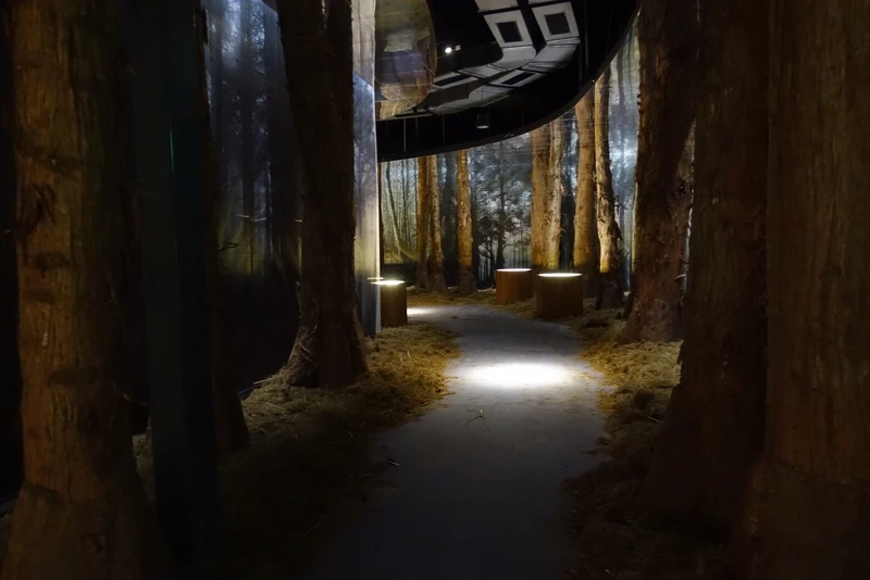 空間溫度的下降、映入觀眾眼簾的是高聳入天的高山森林,觀眾穿梭於山林間,感受雪山美景,並透過植栽標本、花鳥攝影等展品,帶遊客欣賞臺中山林之美。