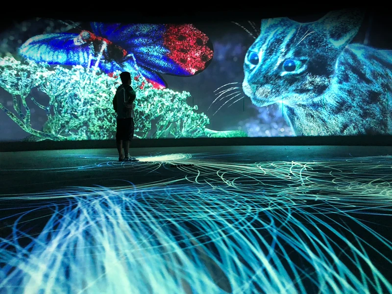 在牆面與地面進行數位互動裝置,給予遊客在視覺感官的衝擊,以「一沙一世界、一花一天堂」的概念,選擇臺灣原生動植物的有機形象,帶領遊客再次眾覽臺中自低海拔至高海拔的豐富多元生態、生物與生命,以數位虛擬手法交替實體與虛體,增加畫面豐富性,也透過大甲溪流域0~3886公尺在臺中的豐富性,昇華轉化,看見臺灣的多元獨特性。
