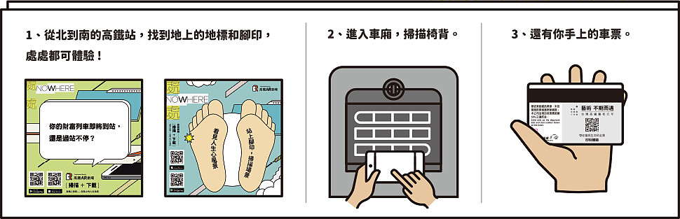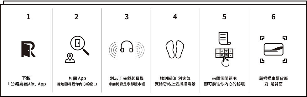 「AR小劇場」使用方式相當簡單,4月底前,旅客只要持手機免費下載「台灣高鐵ARt」App,開啟後便會看見虛擬車站閘口,上方看板可選擇人生旅程想理解的「班次」及到達的「車站」,按下刷票入口後,即可掃描車站內或列車上特定的體驗點,便能打開心旅程,感受一段包含音樂、文字的3D AR動態影像。或者,掃描高鐵磁票背面或車站上網台桌貼,更可以窺見360度全景的AR動態影像。