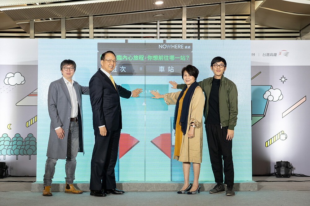 (臺灣高鐵藝術元年-處處記者會宣告啟動,王嘉明導演、台灣高鐵董事長江耀宗、國藝會董事長林曼麗、林昆穎導演(由左至右),共同啟動儀式。)