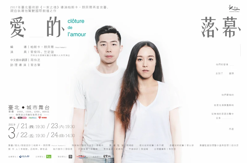 《愛的落幕》講述一段愛情結束前的故事,由台南人劇團與法國知名編導帕斯卡・朗貝爾再度攜手,邀集劇場精彩雙演員合作,3月21至24日於台北城市舞台演出。