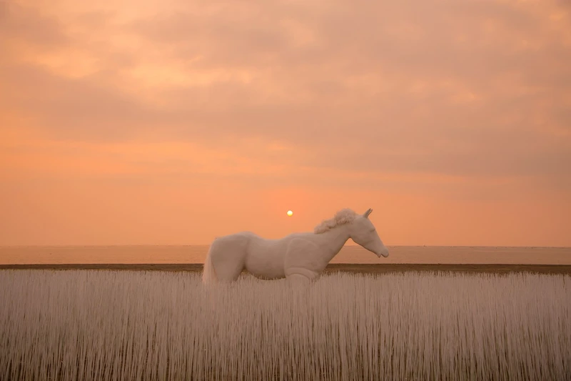 還有什麼比全白色馬更吸引人呢?藝術家游文富以「自然的知覺」為創作核心,帶來他幼時對於秋茂園的回憶,打造一隻白馬走在雪地裡的畫面,搭配落日有如夢裡的景色,相當寫實也相當夢幻!