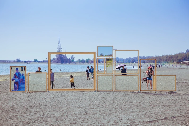 透過策展單位都市藝術工作室所募集對於台南海濱秋茂園的老照片,所有在此留下回憶的景象重新成為裝置在海灘上重現,充滿趣味性的鏡框與畫框效果,讓滿滿溫馨的印象烙印在觀者的心中,相當有味道。