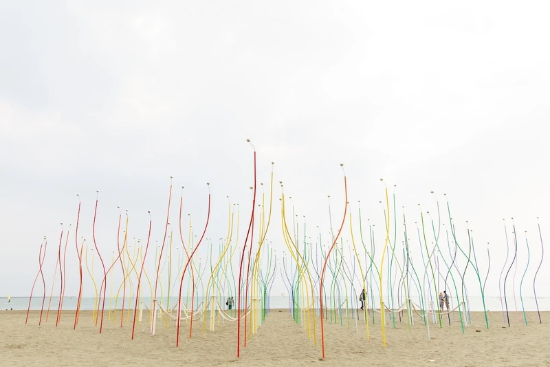 擁有濕地生態的漁光島,展現海陸交界處的豐富生態環境與景色,藝術團隊以此為意象,使用上百隻的彩色金屬管,打造出彷彿紅樹林的的空間,在作品之間,還設有吊床,觀者可以躺在吊床上,享受愜意的時光,既浪漫又舒適。