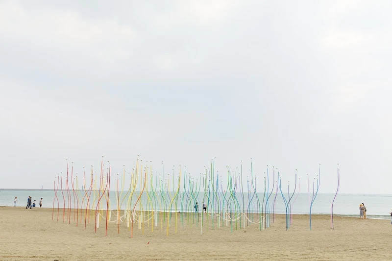透過繽紛色彩的壓克力面版,日光折射出五顏六色的絢爛景象,讓一切有如在Disco的舞池中,喚醒搖擺的旋律,海風吹來時替作品增加的效果,一定要親臨才能感受。由榮獲德國、日本以及金點設計獎的新銳設計團彡苗空間實驗帶來的作品,體現了年輕世代的活潑與熱情。