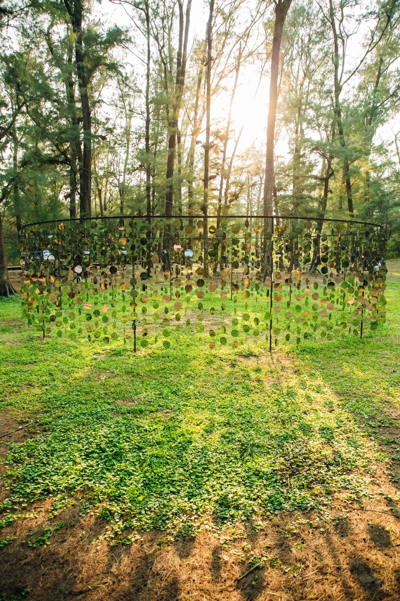 以圓形作為創作基礎,在防風林中架起的圓形鏡圈,交疊的影像造成意外的視覺效果,在光影的折射之中,讓人掉進的虛實交錯的魔幻時刻之中。而鏡面中反射出的自己,讓我們身在其中,表現出人與大自然密不可分的關係。