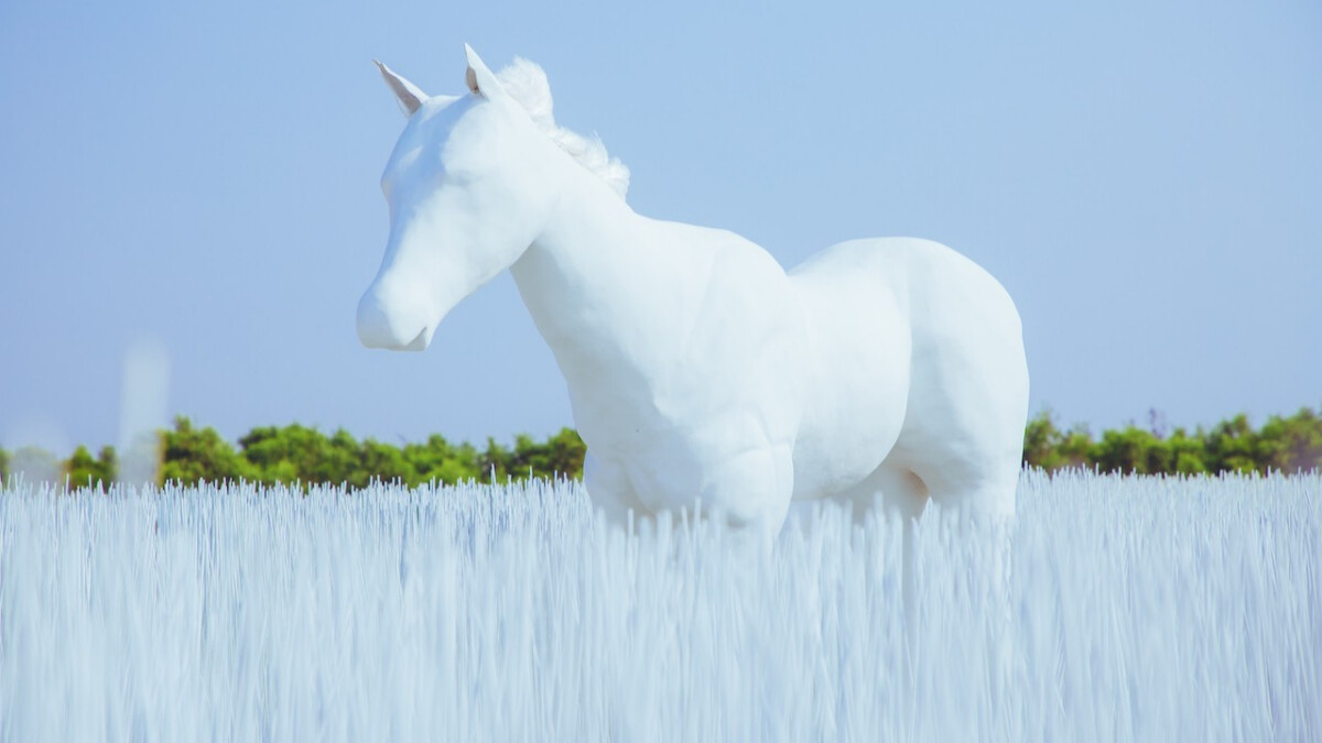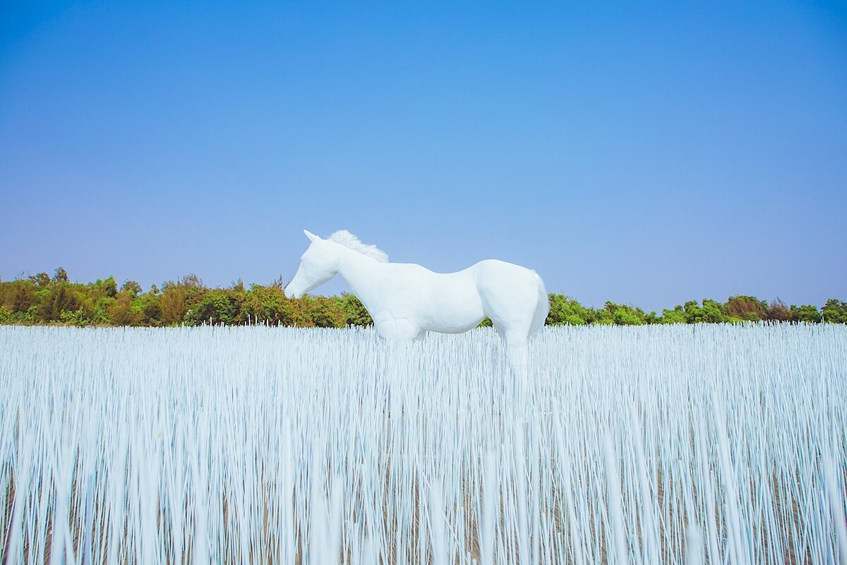 還有什麼比全白色馬更吸引人呢?藝術家游文富以「自然的知覺」為創作核心,帶來他幼時對於秋茂園的回憶,打造一隻白馬走在雪地裡的畫面,搭配落日有如夢裡的景色,相當寫實也相當夢幻!