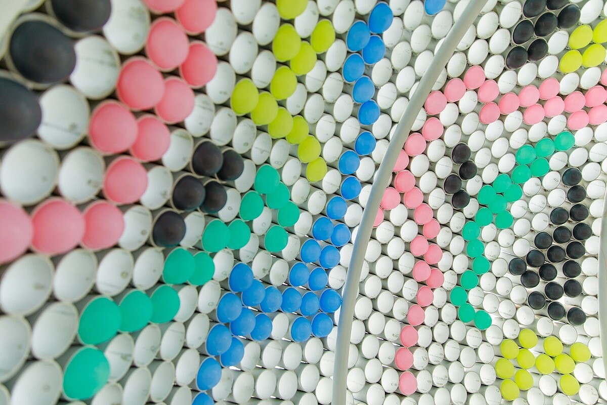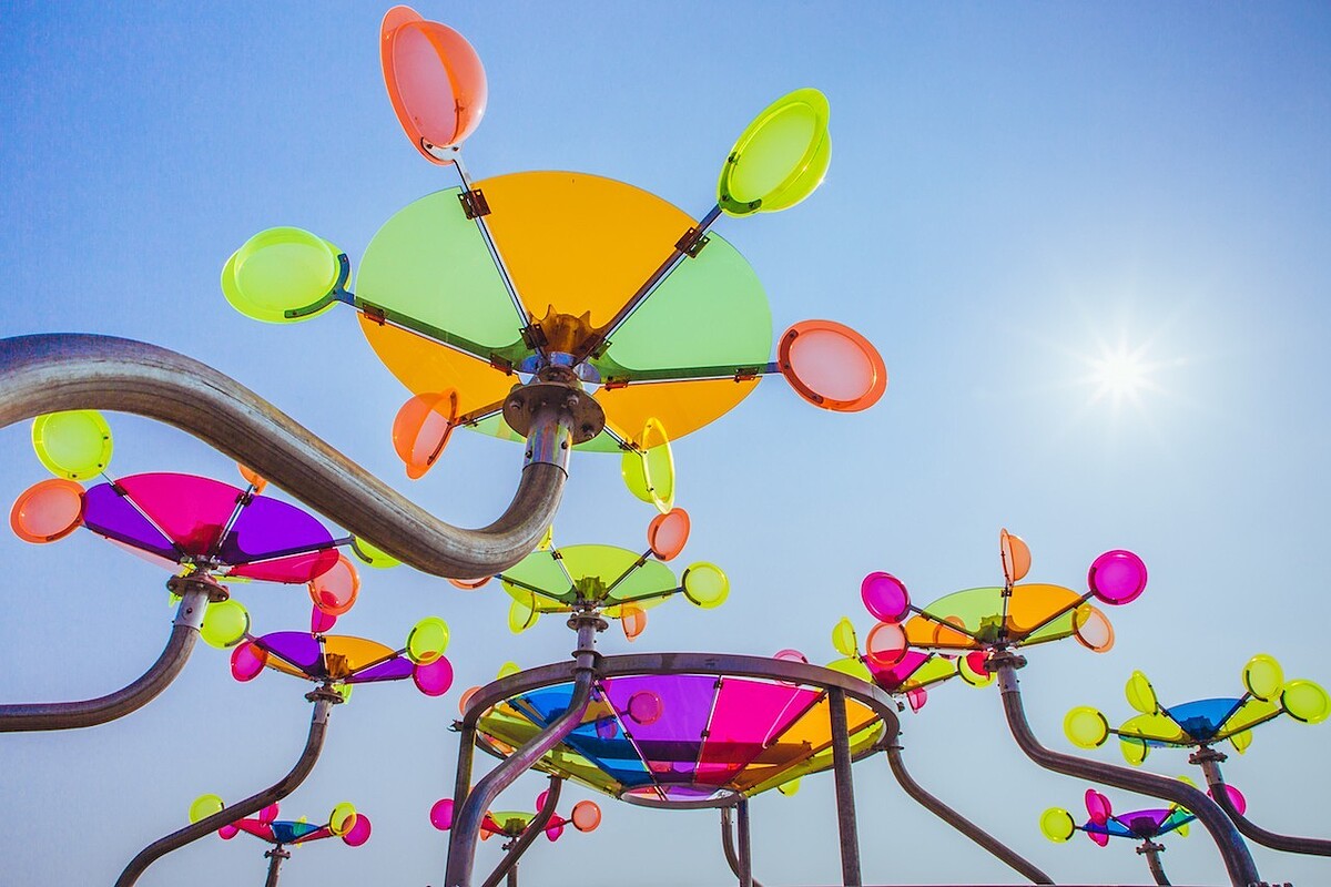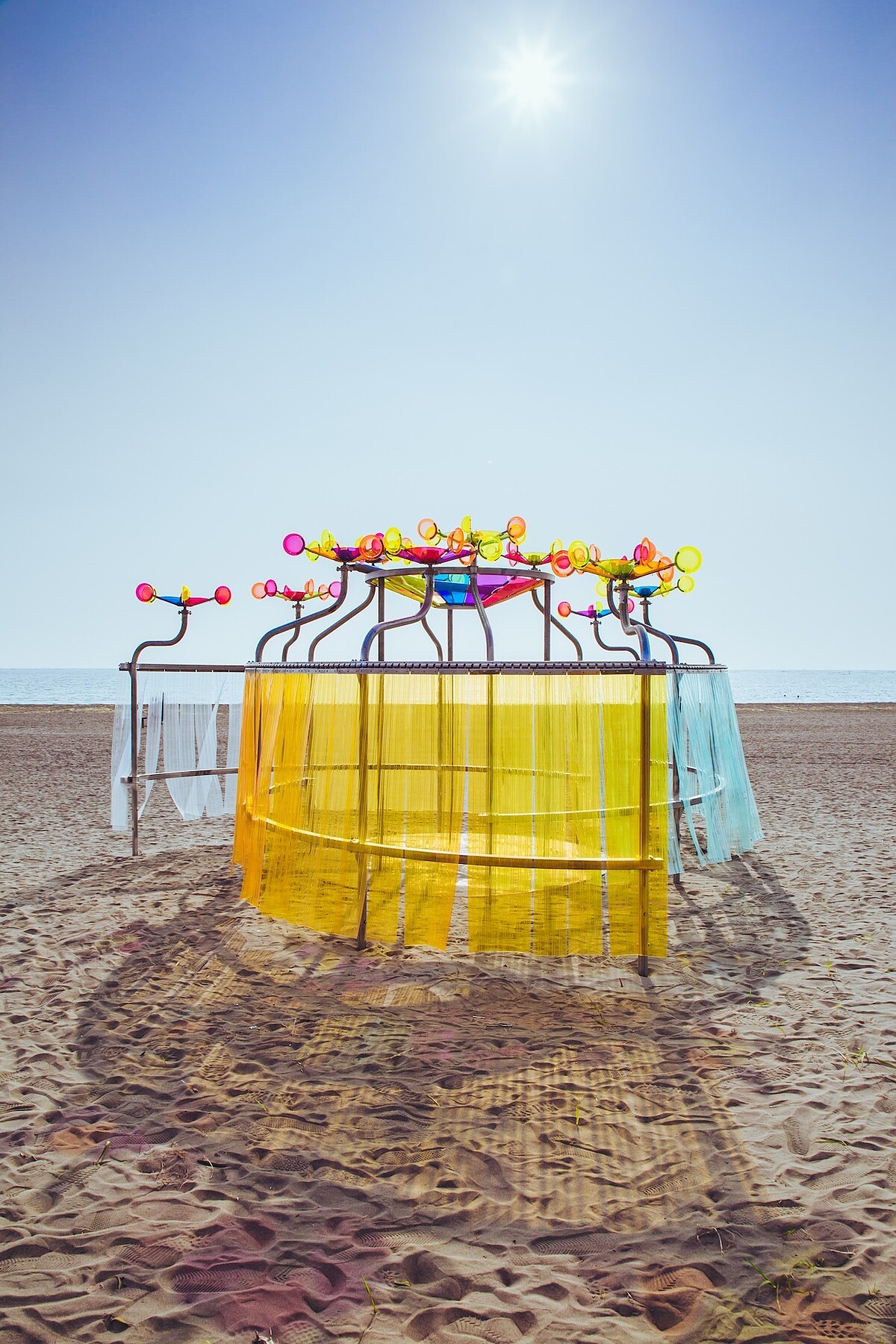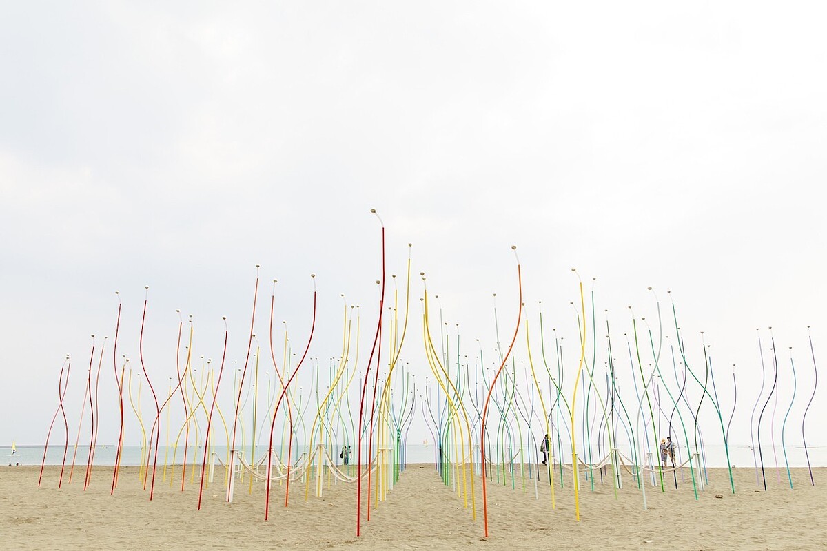 透過繽紛色彩的壓克力面版,日光折射出五顏六色的絢爛景象,讓一切有如在Disco的舞池中,喚醒搖擺的旋律,海風吹來時替作品增加的效果,一定要親臨才能感受。由榮獲德國、日本以及金點設計獎的新銳設計團彡苗空間實驗帶來的作品,體現了年輕世代的活潑與熱情。