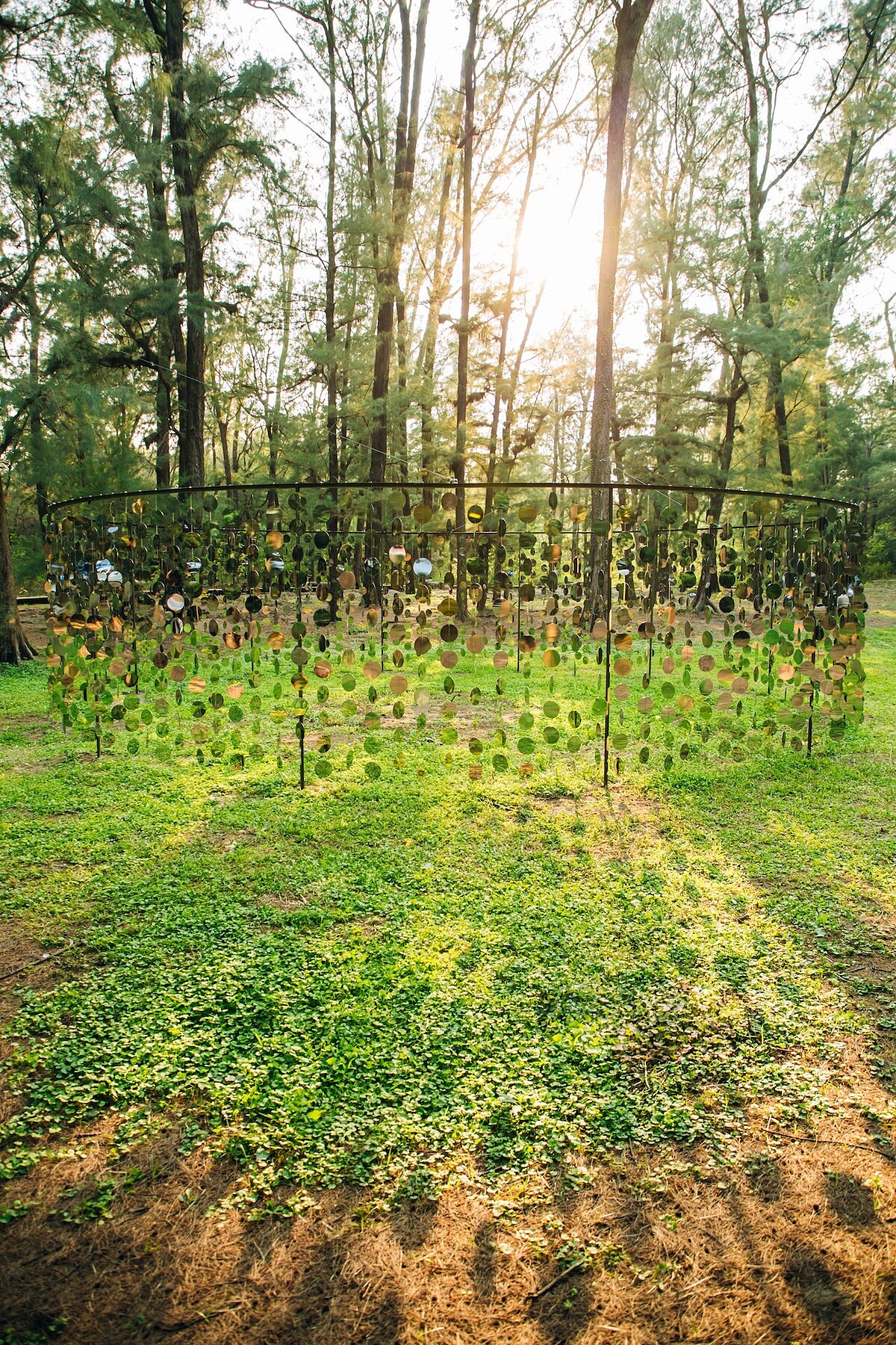 以圓形作為創作基礎,在防風林中架起的圓形鏡圈,交疊的影像造成意外的視覺效果,在光影的折射之中,讓人掉進的虛實交錯的魔幻時刻之中。而鏡面中反射出的自己,讓我們身在其中,表現出人與大自然密不可分的關係。