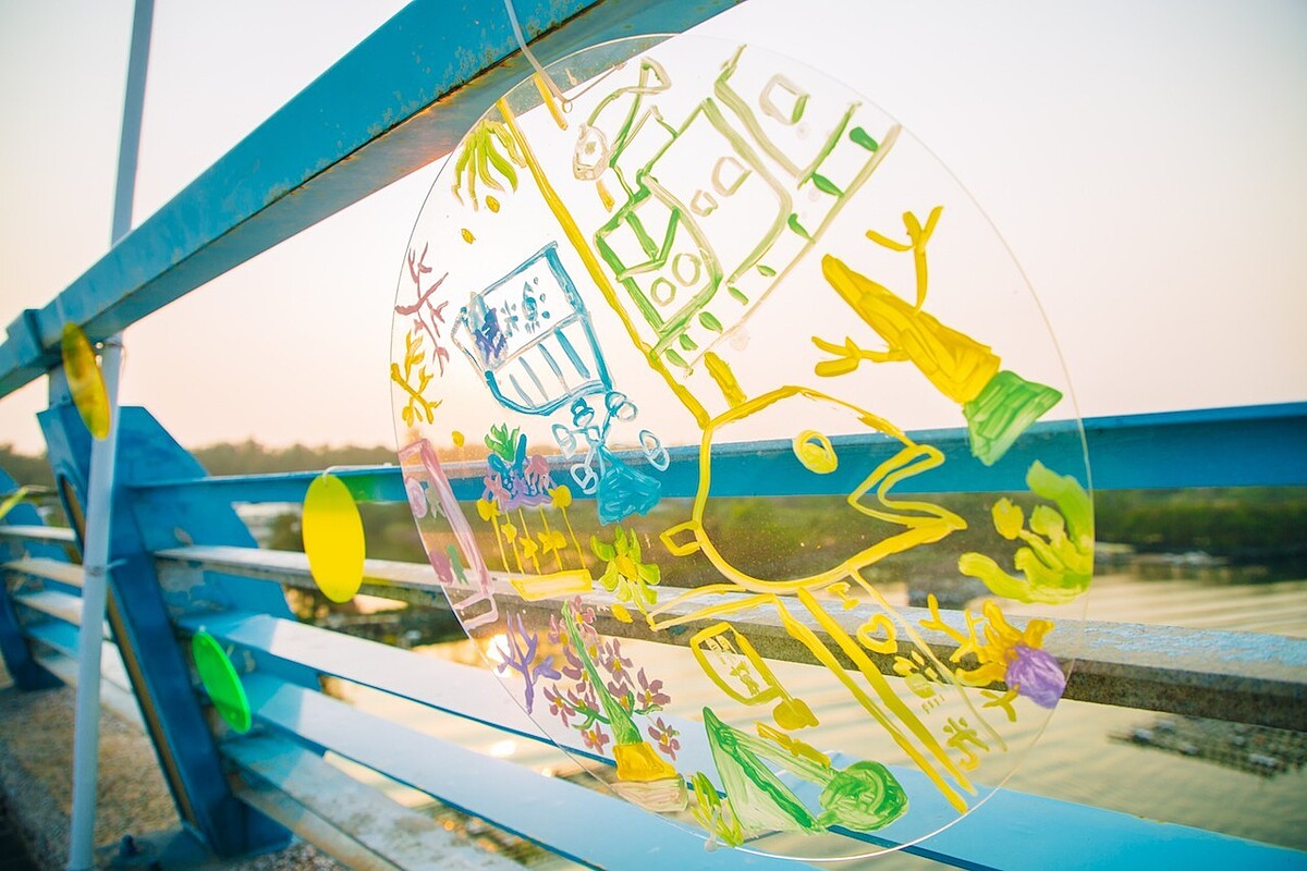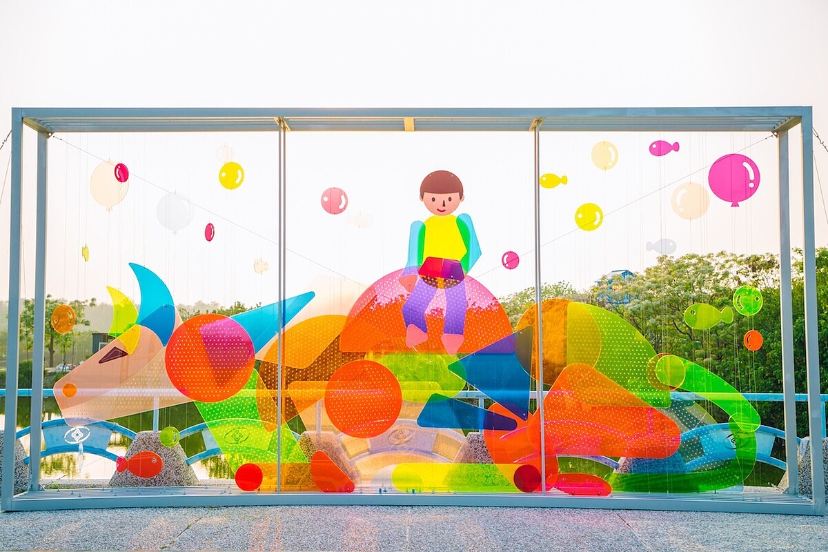 踏進藝術節前,就能夠感受到億載國小的小朋友們豐沛的創作能量,壓克力板上畫的是孩子們心中的夢幻樂園,透過光影的照射,在不同時刻有不同的質地。孩子們心中那座最無邪純真的樂園,正熱烈歡迎著所有旅客的到來。