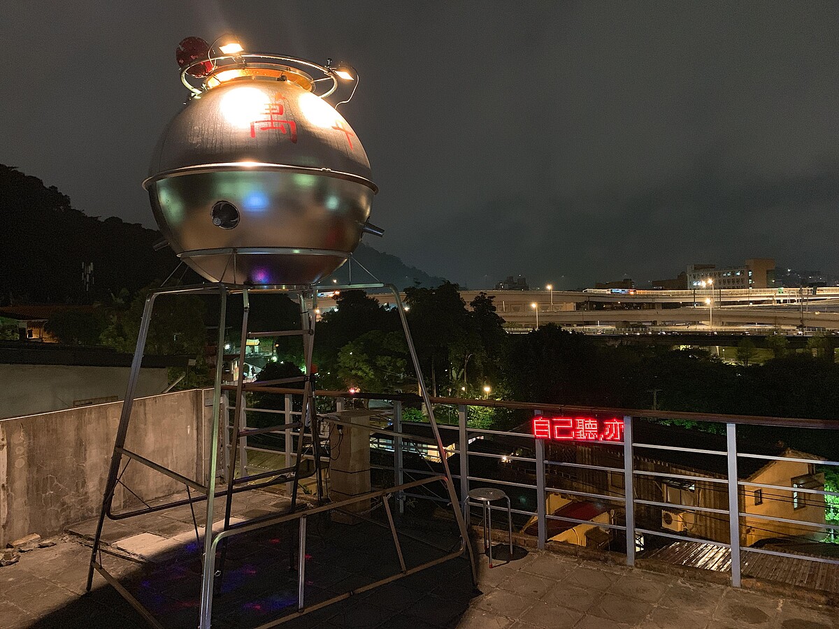 出身基隆、畢業自北藝大新媒體藝術學系的藝術家李承亮,把球型水塔改造為舞台廣播系統,建構在寶藏巖的半樓廣場之上,藉此帶出無人劇場的奇幻視覺感。來此參觀的人們,可以爬上如同太空登陸的水塔屋頂高歌一曲,也可以站在一旁,靜靜觀賞藝術與城市交織的魔幻篇章,一同享受這偏離生活常軌的時刻。