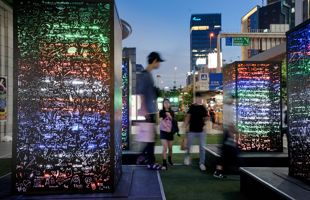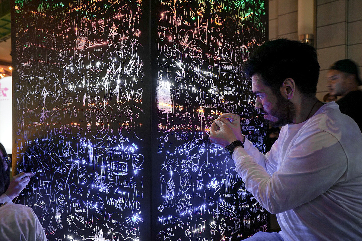 5月25日上午開展後未到中午即聚集人潮在六本木之丘北塔前的廣場,從一開始對於廣場上四個龐然大物的疑惑,在工作人員提供金屬細棒引導下,創作欲大發的日本觀眾紛紛靠過來留下印記,《黑暗中的彩虹》開啟了一場不分國籍的大眾對話,到了夜晚,在裝置內的多彩LED燈條照亮下,這些隨著時間累積而被刻劃下的文字與圖像透出彩虹光芒,象徵傷痕背後的希望。在週六夜間活動高峰時間,儘管作品上早已刻滿了密密麻麻的文字與圖案,往來人潮就像受到作品所發出的光芒召喚,依舊絡繹不絕地試圖在黑色箱體上找到空間留下訊息。《黑暗中的彩虹》也成為本屆「六本木藝術之夜」最受歡迎的作品,更受到主展藝術家崔正化稱讚「觸動人類原始本能反應的佳作」。