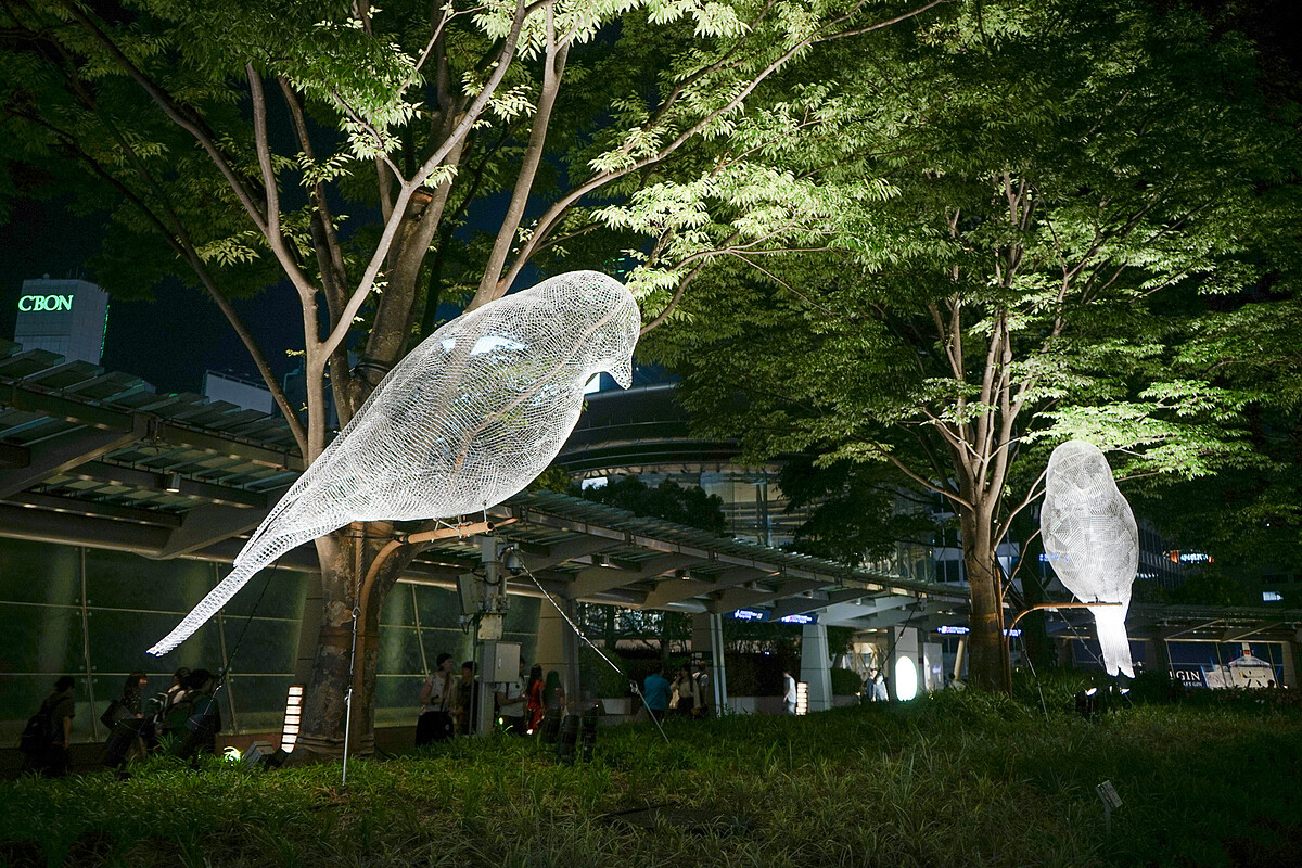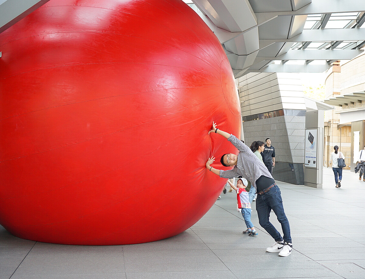 開展前七日啟動的《紅球計畫》(Red Ball Project)邀請觀眾在六本木各地尋找大紅球,不管是國立新美術館、21—21Design Sight或是森大樓廣場,都成為人氣聚集的亮點,也成了開展前最棒的宣傳!法國藝術家Cedric Le Borgne的《慾望與威脅》(Le Desir et la Menace)以鐵網所細膩編織出的巨鳥,白天安靜無形地駐足在森大樓前廣場,夜晚在燈光照射下才顯露優雅蹤跡。美國藝術家Andrew Binkley的《石雲》(Stone Cloud)與日本藝術家大西康明的《循環》(Circulation)充分運用手扶梯空間,一上一下,重與輕的錯置,成了日夜不停的夢境場域。