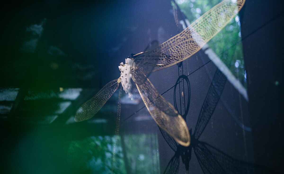 透過黃銅的切割塑型,以酸液腐蝕鏤空,製作出翅脈自然破損的有機透明感,再以手工一格一格挫修、拋磨,細膩的呈現出蜻蜓翅膀鏤空的細節。對應著金工繁瑣的製工,巨大的展翅讓人驚艷!