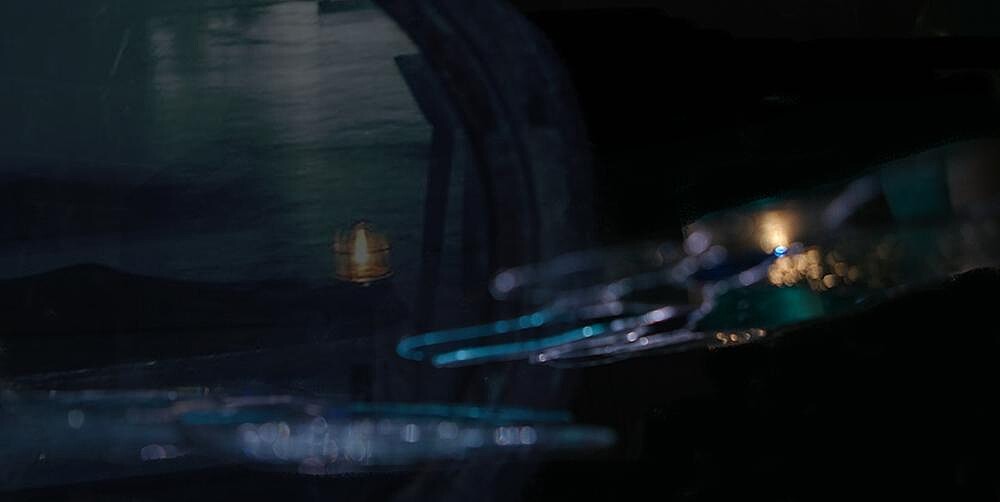 回收的老窗花玻璃與老舊的船塢原件,重新創作成波光粼粼的燈飾與裝置,一層一層反射記憶中的窗花印象與深海湛藍。廢棄的船塢原件與鐵件重組,懷舊的元件與流線的設計線條,對比成有趣的新舊對話。