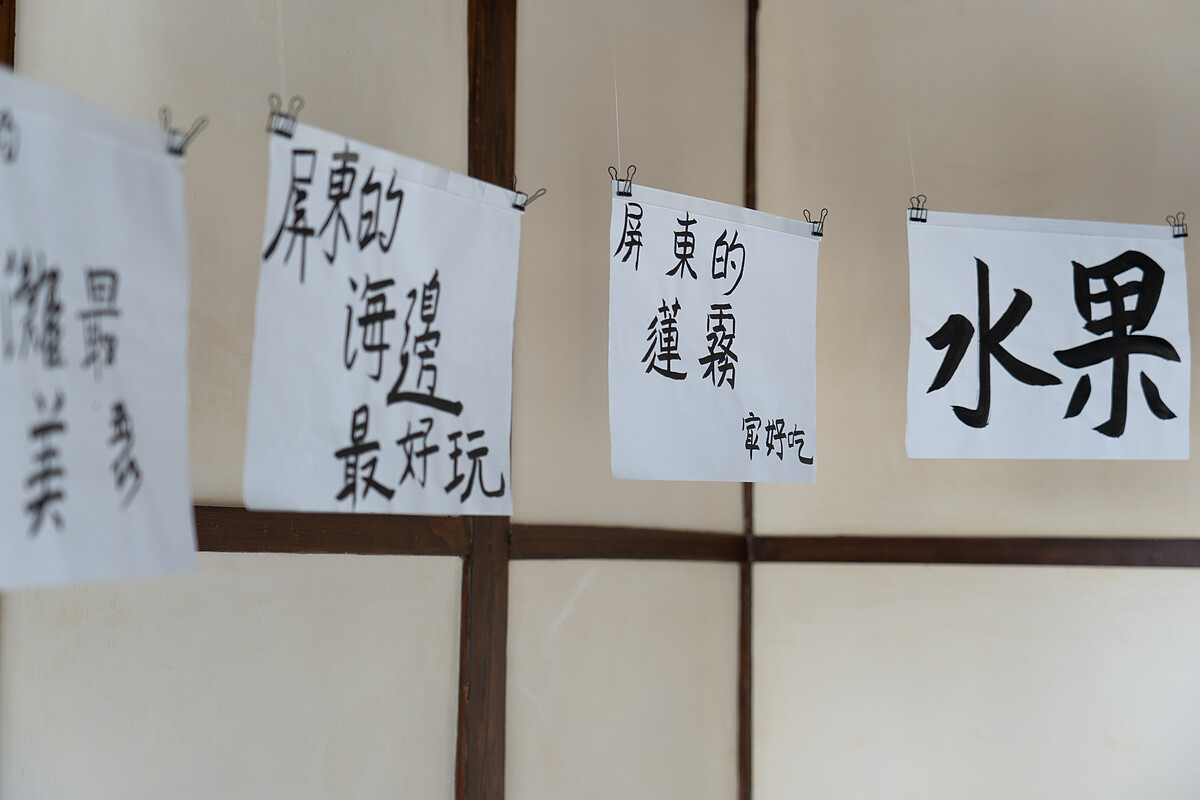 【人】展區從傾聽現在的聲音開始,眺望未來的想像:結合地方意象與手寫書法的動態圖像設計,萃取了國境之南自然生態與豐饒物產貫穿其中,通過意象的編排串接起屏東的過去、現在、未來;來自屏東縣公館國小書法班的學生以童趣筆觸書寫對屏東的喜愛及展望,還有每一本關於屏東的作業本,都讓人一窺孩童眼中的屏東之美,亦得以預見國家未來主人翁心中想望。