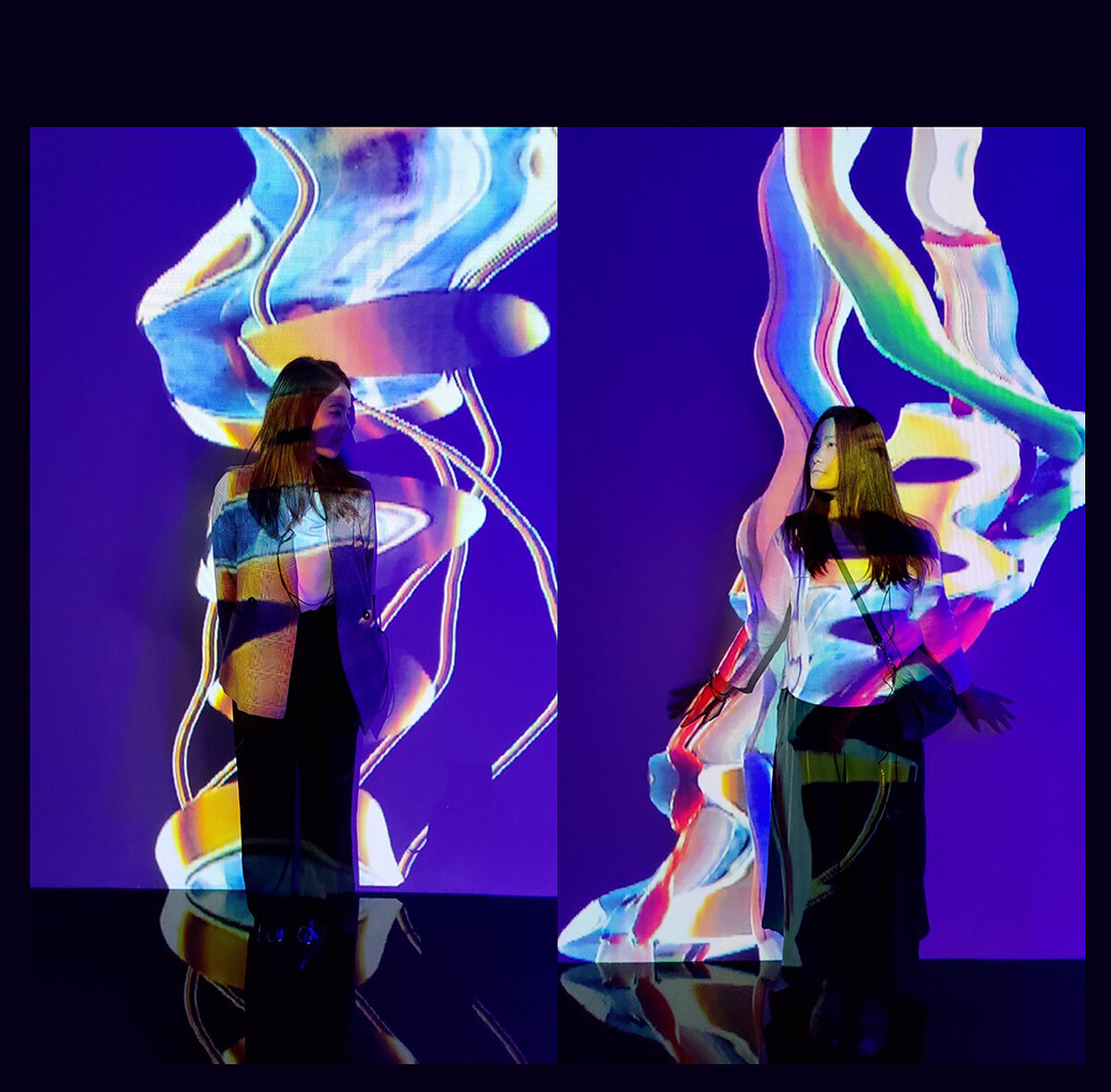 還可以搭配藝術家特別設計的影像,將影像以左右鏡射方式,加上橫向擴散、疊影、壓縮呈現在前方大螢幕上,迷幻的跟自己拍一張做紀念,還有什麼打卡照比這個還特別,也可發揮自己的創意,將動作與影像做出絕妙搭配,創作出自己的「Master Piece!」。(快來猜猜M編這張自拍擠了幾位同事!!)