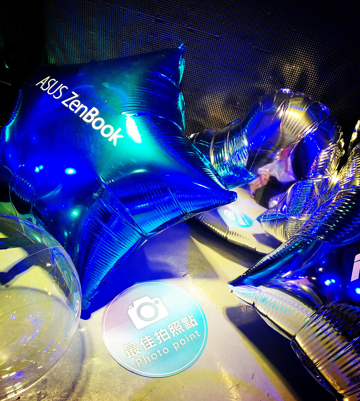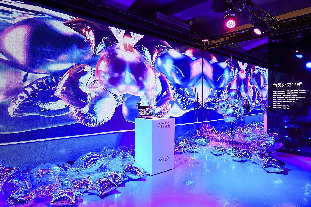 接著第二區,「內與外之平衡」延伸出來的就是影像的水平變形,一樣透過ZenBook Pro Duo的觸控雙螢幕,大畫面呈現整體視覺,下方的 ScreenPad Plus 螢幕則變成操縱選單,讓現場燈光隨心切換模式毫不費力,現場還佈置了超~多金屬藍色、銀色與透明氣球,創造出帶有些未來感的空間。