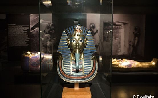 當然各位不能夠錯過的重要展件包括重 1104 公克,高 54 公分,由黃金打 造,鑲有青金石、黑曜長和英碧輝煌的「黃金面具」、距今3300 年歷 史,收藏在柏林新博物館的「娜芙蒂蒂」、「國王座椅」、「站在獵豹身上的圖坦卡門雕像」等。