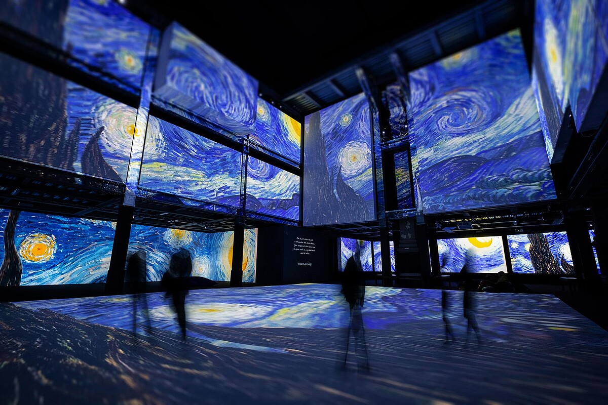 以40多台高畫質投影機搭配影院級環繞聲效,加上360度環繞式巨型螢幕所建構而成的空間,在李斯特、韋瓦第、舒伯特、巴哈的樂章陪襯之下,讓觀眾彷彿穿越至19世紀,親身體驗梵谷的創作生涯,跳脫「純觀看」的形式,以全新角度感受梵谷。