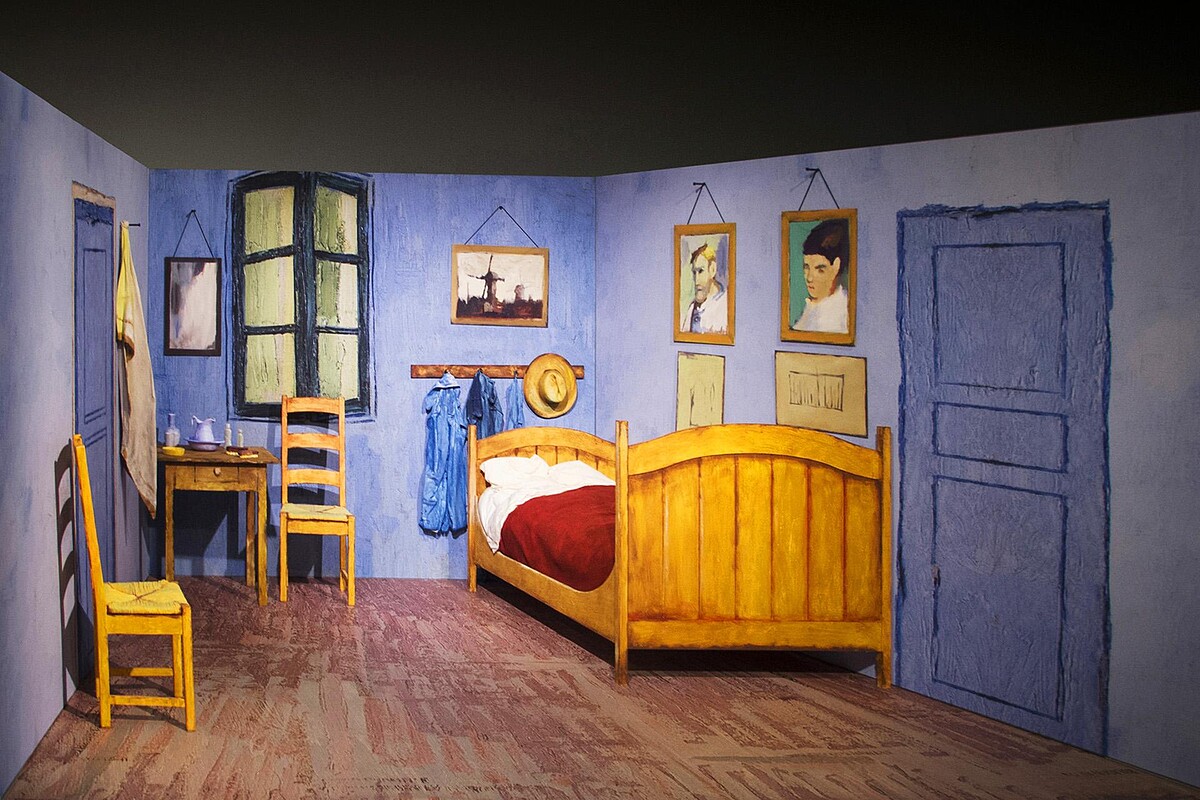 除了主要投影展區,展覽中另有「認識梵谷」靜態展示區,透過《向日葵》、《星夜》、《麥田群鴉》、《杏花盛開》和《紅色葡萄園》等13件最膾炙人口的作品介紹,引導觀眾走入梵谷曲折而短暫的一生;「亞爾的臥室」則以現場實景重現梵谷生前最後兩年的創作時光,讓觀眾一腳踩進經典畫作之中。