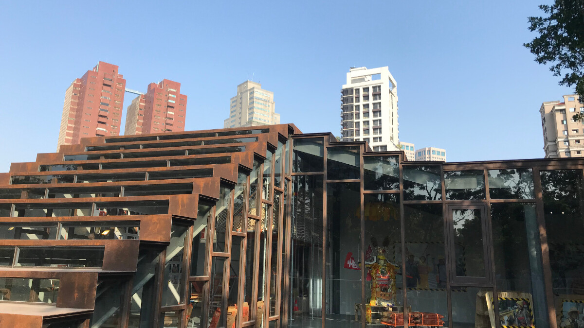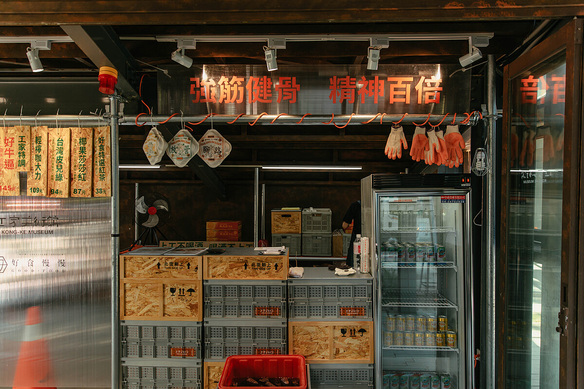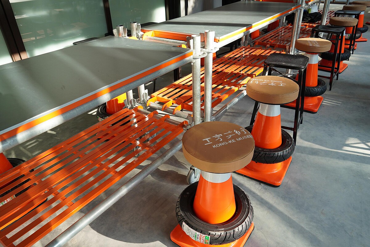 工地美術館的開放式空間有著老榕樹的綠蔭,以及玻璃為主的通透感;一樓是大中庭以及工人吃午飯的食堂,設計元素充滿亮橘色、灰階金屬色,呈現屬於台灣味的工業風,二樓是藝術裝置與攝影的主要展出空間,同時也是工人平時中午小憩的地方。走到樓頂的開放空間除了休息,更能開闊地觀賞城市景觀。