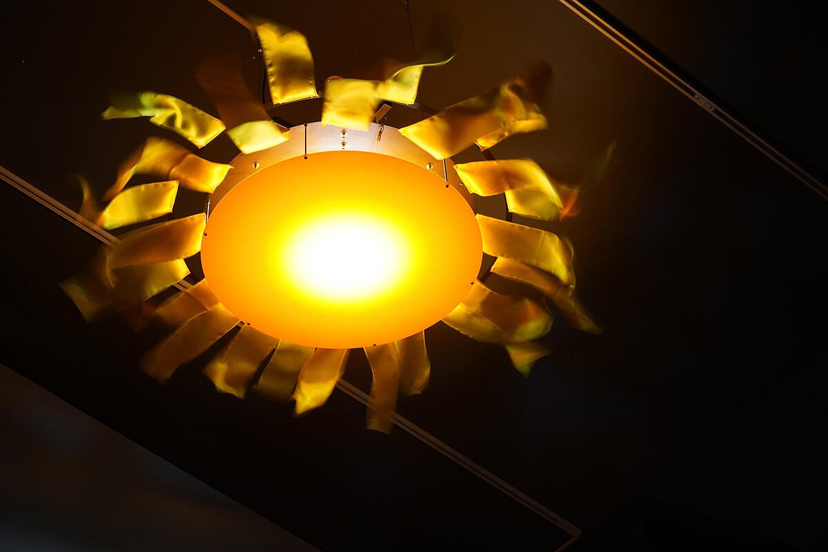 工人睡午覺是生活一大要事,擅長機械動力裝置、創作以運動的美學為基底的盂施甫藝術家,在二樓午睡空間,使用橘色和黃色等工地常見警戒色,創作天花板的圓形涼扇「涼日」。