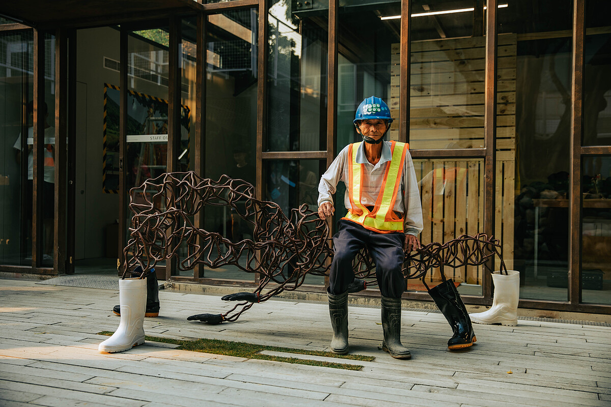 中庭裡戴翰泓的公共藝術座椅「工地獸」,把工地常見的雨鞋、鋼筋元素組合成一個生猛的景象。扭曲的鋼筋把自然與人為的力量凝結並記錄下來,展演人與土地競合的過程充滿的動物氣息。