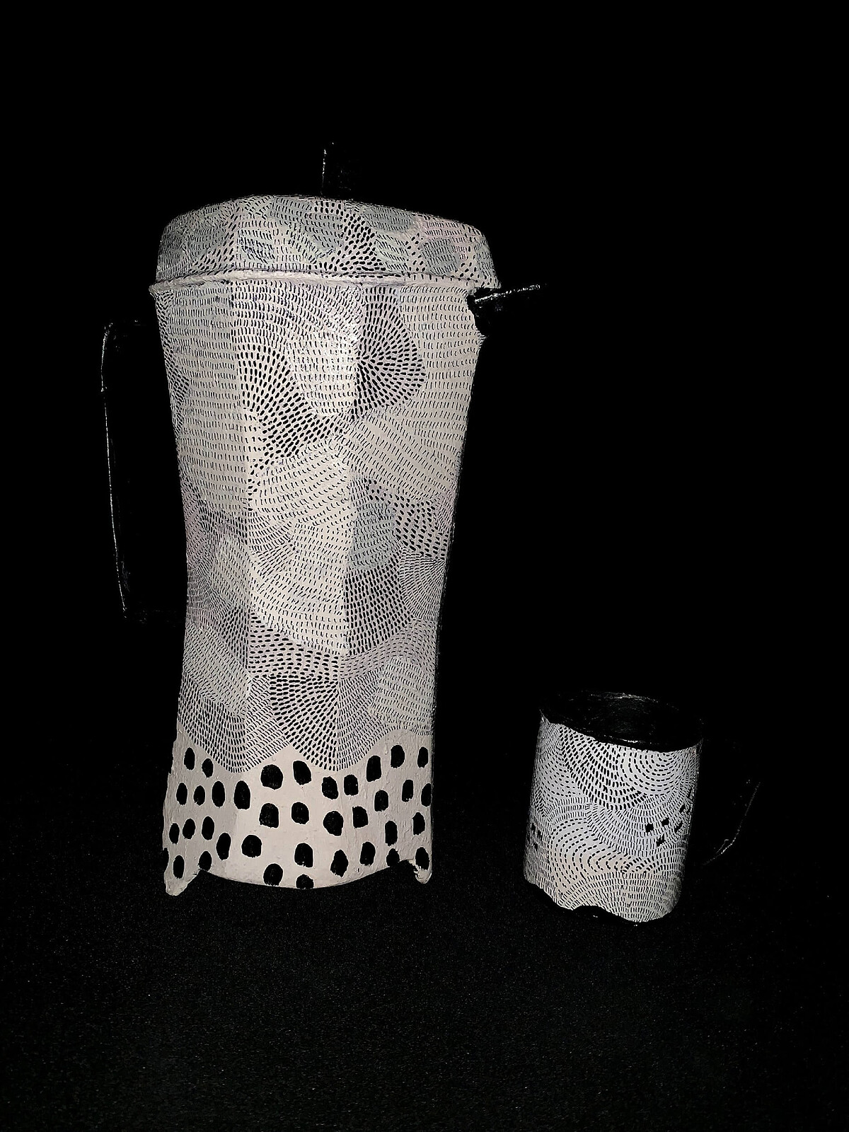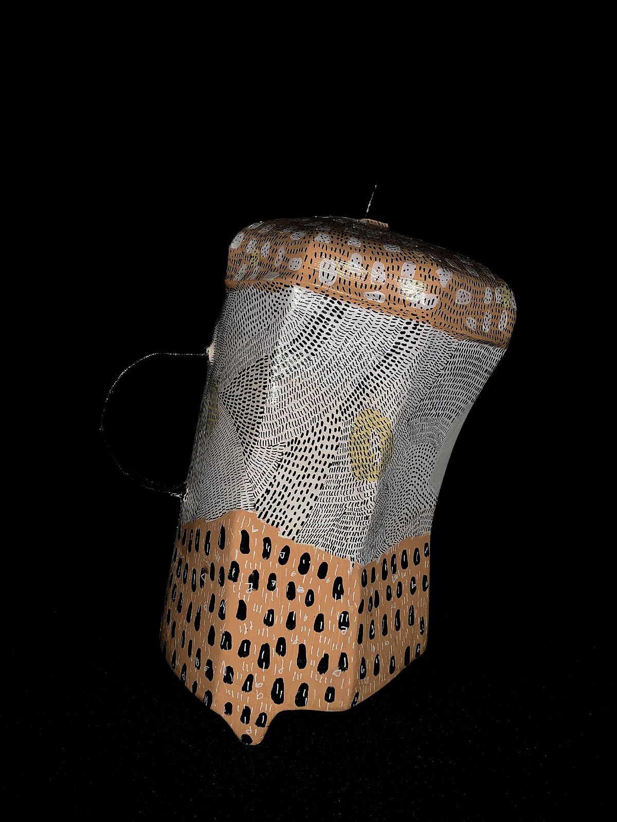 對Wanyan Novi而言,靜物畫是一項非常重要的技巧,培養對於物件的觀察力以及表現存在的狀態,對他如何使用層疊、交錯、暗示線條與點描來表現物件具有關鍵影響。這次來台展出的「Dialogue(對語 )」系列立體作品,採用靜物形體成為立體畫布,再將顏料、鋼珠筆描繪其上,讓物件實體與繪畫構成的空間產生有趣的對應。